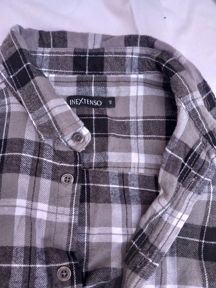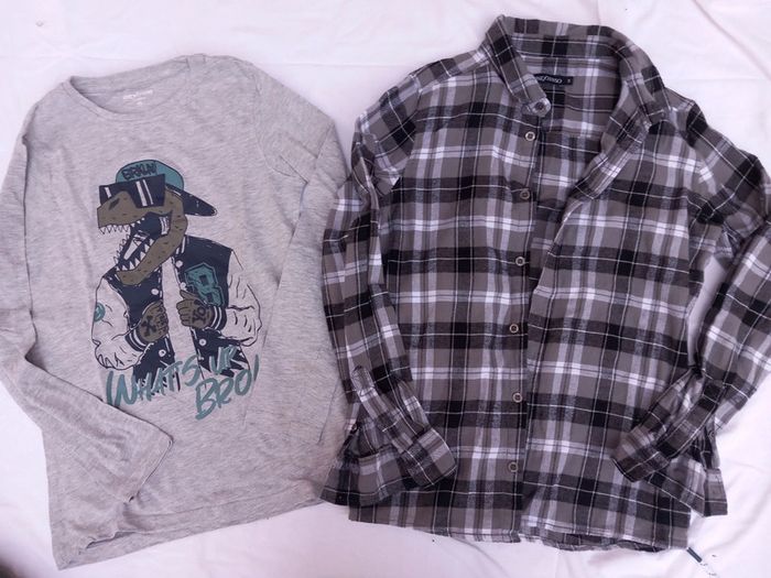 En lot ou à l'unité marque in extenso en taille 10 ans 1 chemise à carreaux grise noir et blanche 3€ et 1 haut manches longues gris 2€