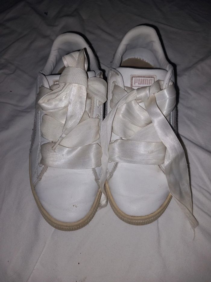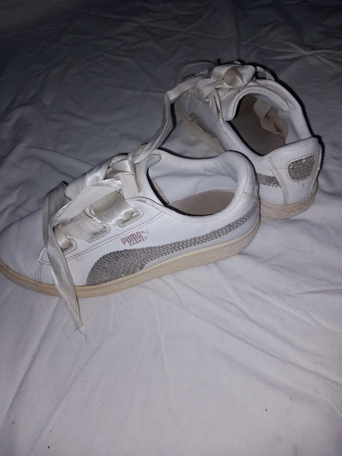 Basket puma blanche avec le signe en sequins en taille 35 et gros lacets satinés. La semelle est à déjaunir.