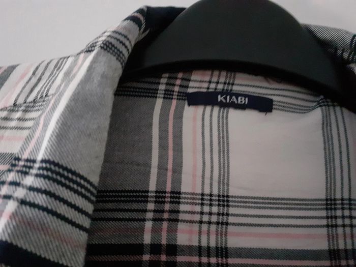 Chemise manche longue femme à carreaux noir, blanche et rose. Kiabi taille 46/48