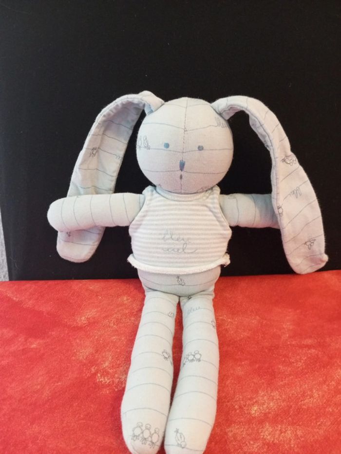 Vends ce doudou lapin aux grandes oreilles bleu ciel avec des dessins d'oiseaux de la marque Petit bateau . Très bon état, vendu comme sur les différentes photos. Dans mon dressing, il y a d'autres peluches, des Petshop, des Lego Duplo, des Playmobil, des Barbie et beaucoup de jeux et jouets vintage #Nourriture06_doudou