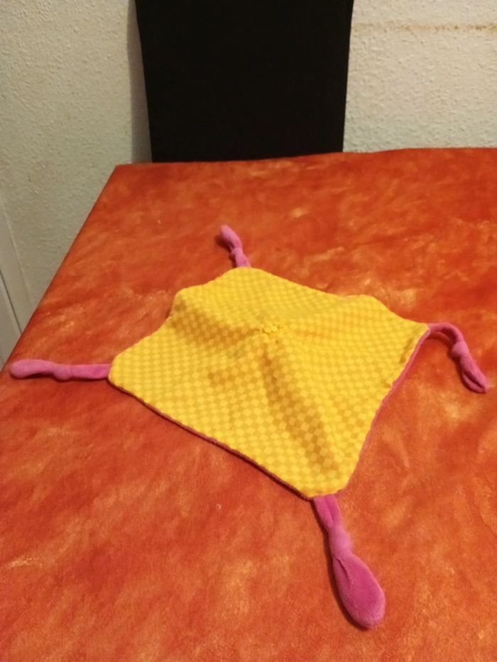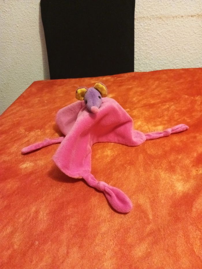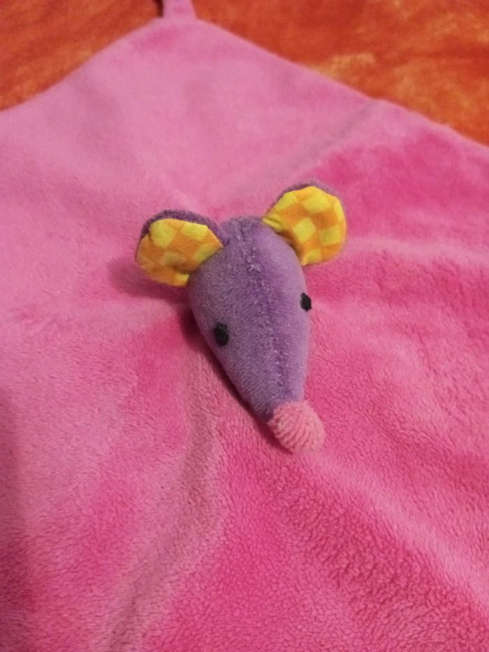 Doudou plat carré rose avec nœuds aux extrémités, au centre souris violette, oreille et arrière vichy jaune orange. Très bon état, vendu comme sur les photos N'hésitez pas à visiter mon dressing, il y a des Duplo, des Playmobil, des Barbie et beaucoup de peluches et jouets vintage #Nourriture06_doudou