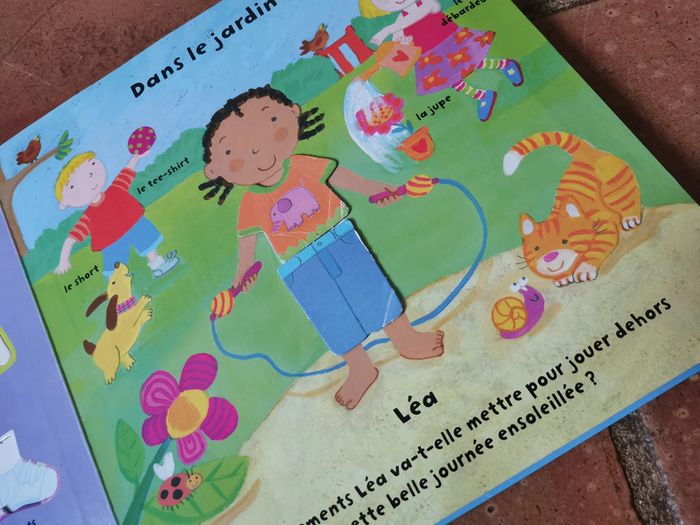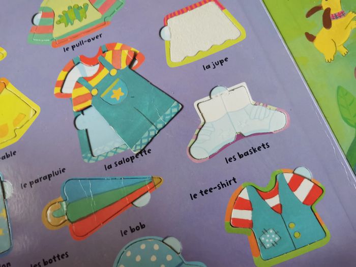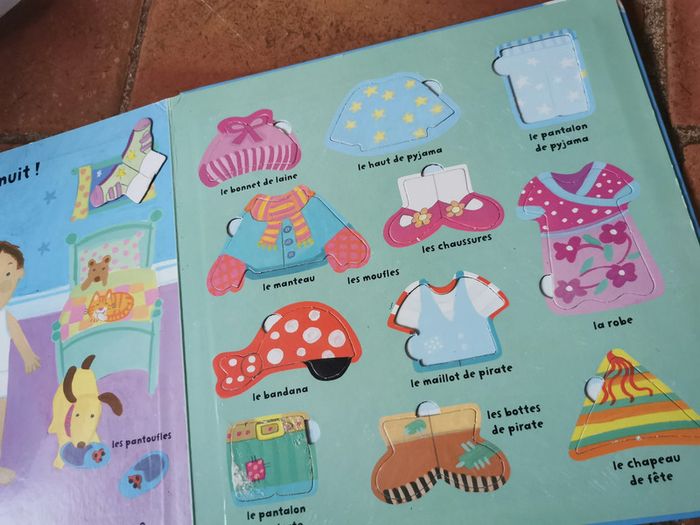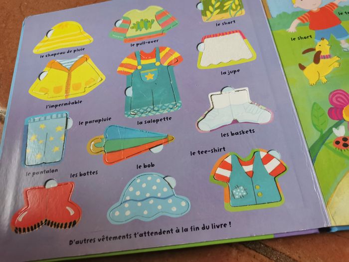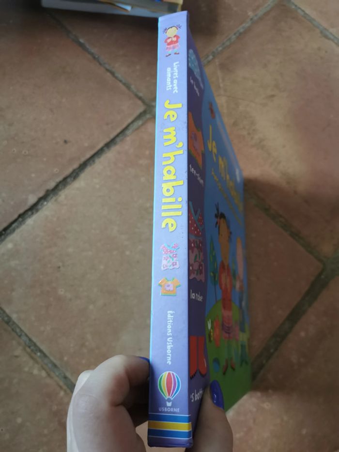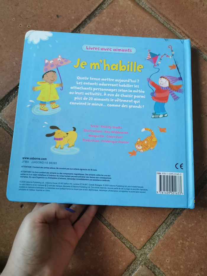 Livre avec aimants Je m'habille. Livre avec plus de 20 pièces aimantées, en bon état général, quelques pièces sont abîmées (voir les photos), livre est rigide avec les pages épaisses, 10p., éd. Usborne, livre à partir de 36 mois, poids 1,2kg. Pensez à faire des lots afin de bénéficier des remises que j'ai régulièrement sur ma page. #jemhabille #livredactivites #livrejemhabille
