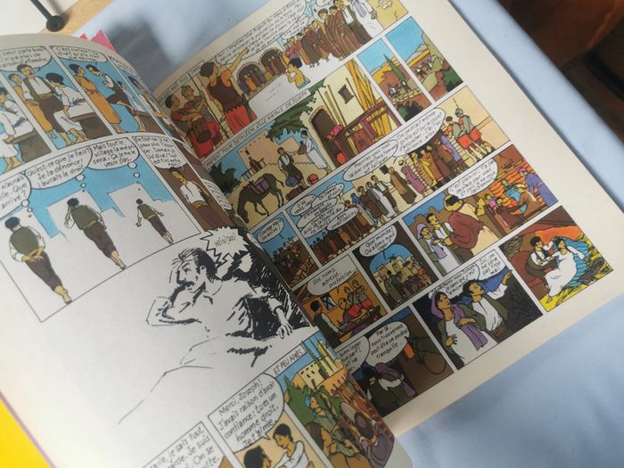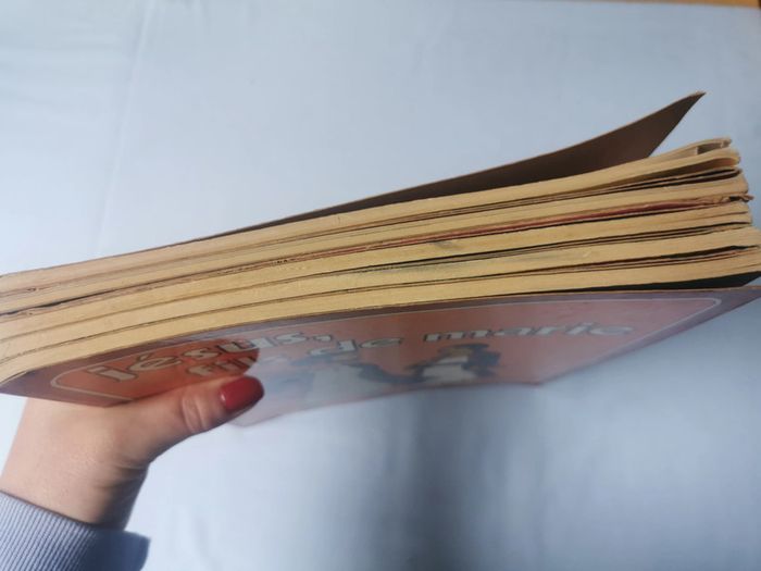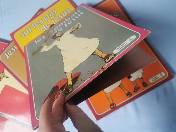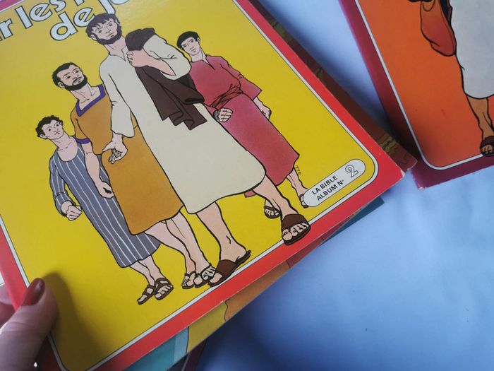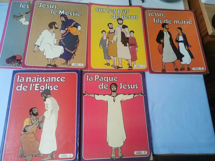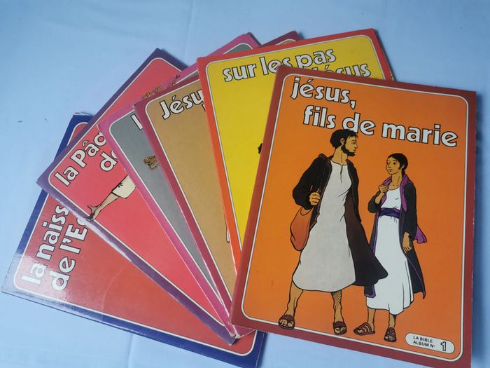 La Bible 5 Albums BD. Le lot n'est pas dissociable et comprend les albums numéros : 1,2,3,5,6 et seulement la couverture de l'album 4. Les BD religieuses en très bon état, sauf la 2 la couverture est détachée et le 5 manque un petit coin en bas de la couverture. Chaque album est composé de 48p., vintage probablement des années 1970/80, poids du lot fait 984g. Pensez à faire des lots afin de bénéficier des remises que j'ai régulièrement sur ma page. #bd #bdreligieuse #albumbd #jesus #religion