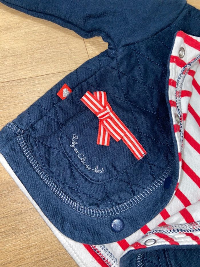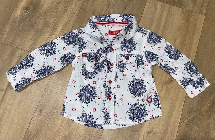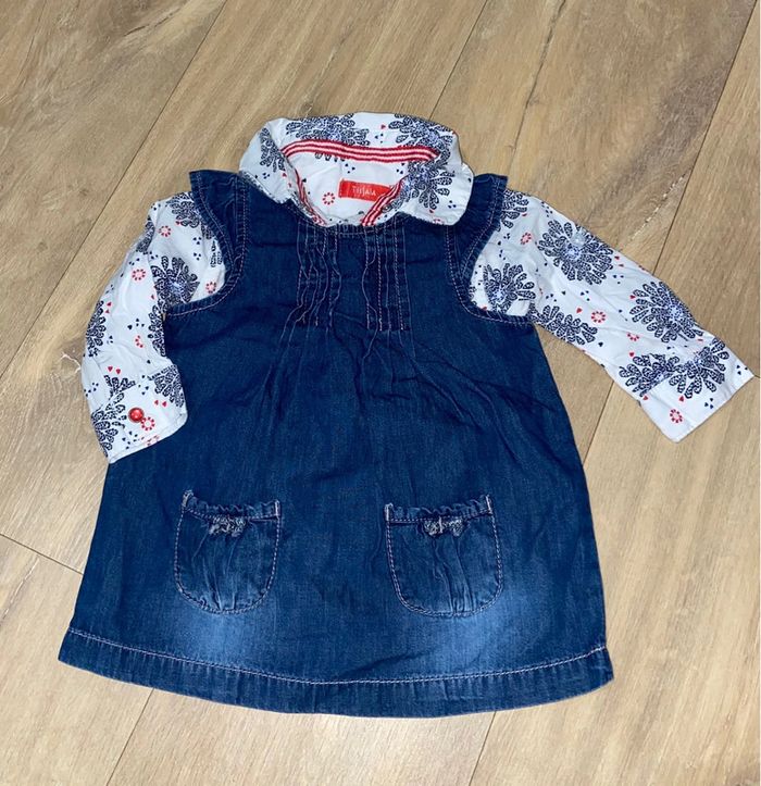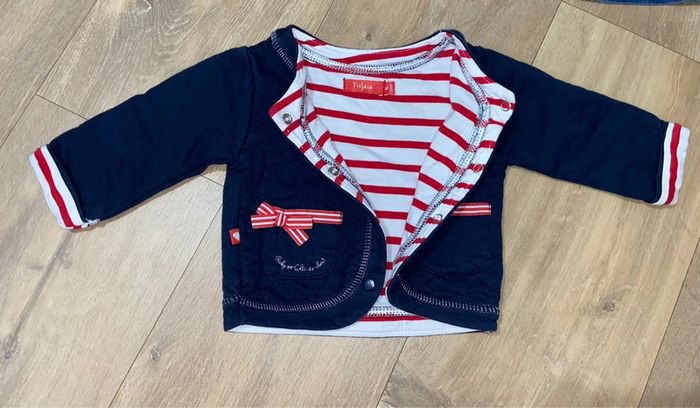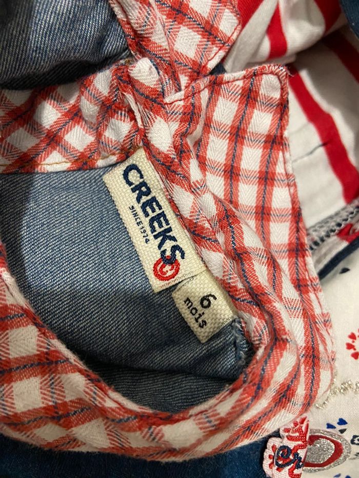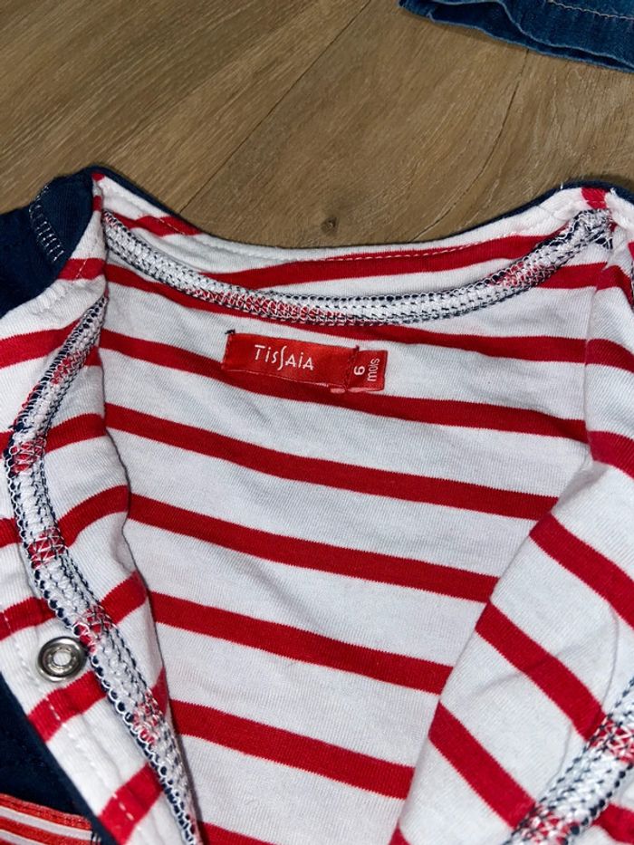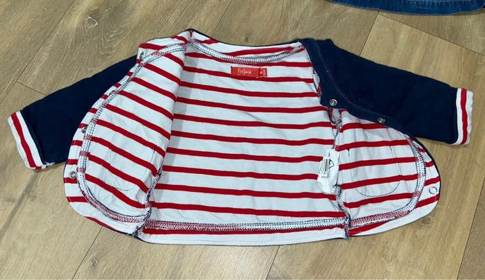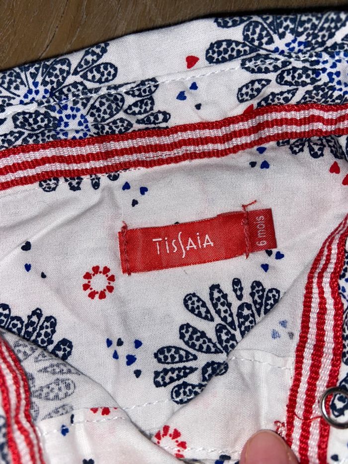 Lot 6 mois : 1 chemise blanche à motif Tissaia (jamais portée) 1 blouse en jeans Creeks 1 Blouse à carreaux (liserés dorés) Primark 1 Robe en jeans Tex 1 gilet 100% coton, marinière rouge/blanc à l’intérieur Tissaia (jamais porté) Défauts en photo