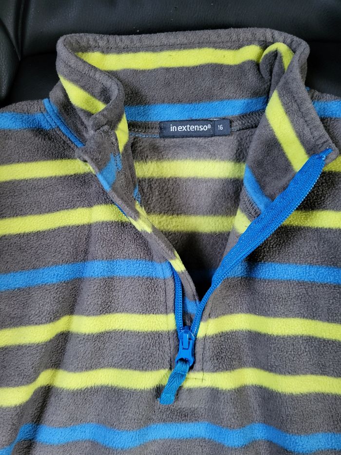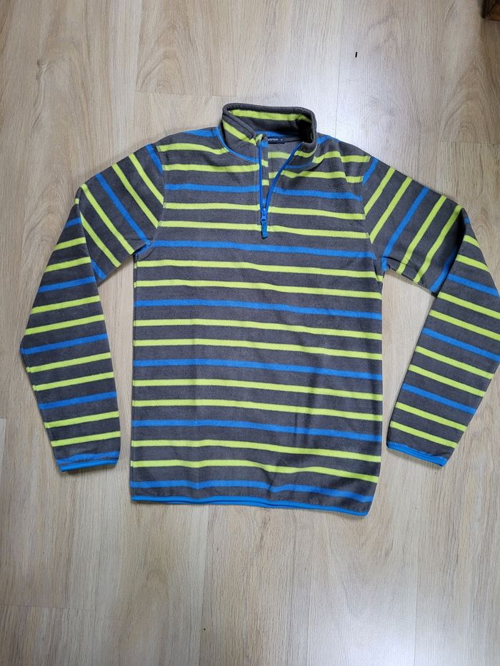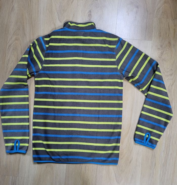 Polaire de belle qualitéPolaire de belle qualité. Très peu portée. Pas abîmée. Gris rayé bleu et jaune. jaune.