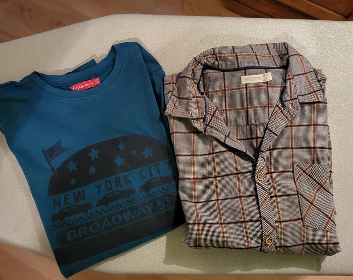 1 chemise Orchestra portée 1 fois, en très bon état + 1 Tee-shirt bleu, pas abîmé.