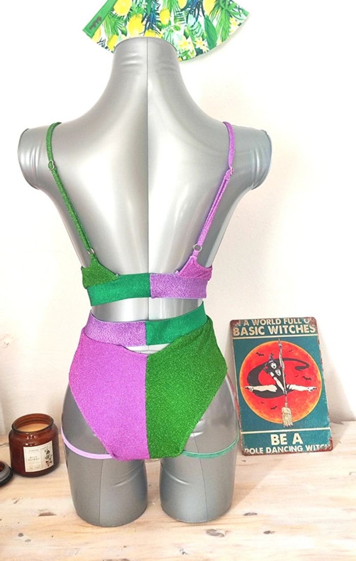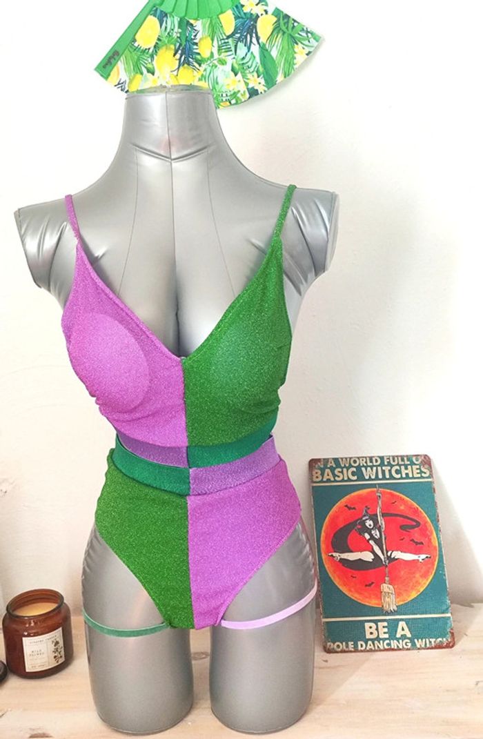Ensemble de pole dance thème Joker Tissu pailleté Bretelles réglables Culotte taille haute Élastiques jarretière Convient pour une taille S #poledance #polewear #poledanceoutfit #poledanceclothes #thejoker