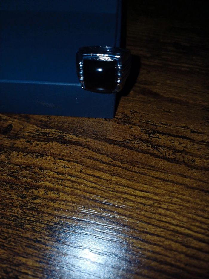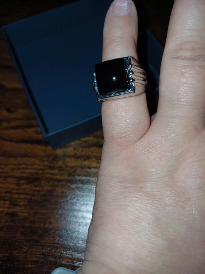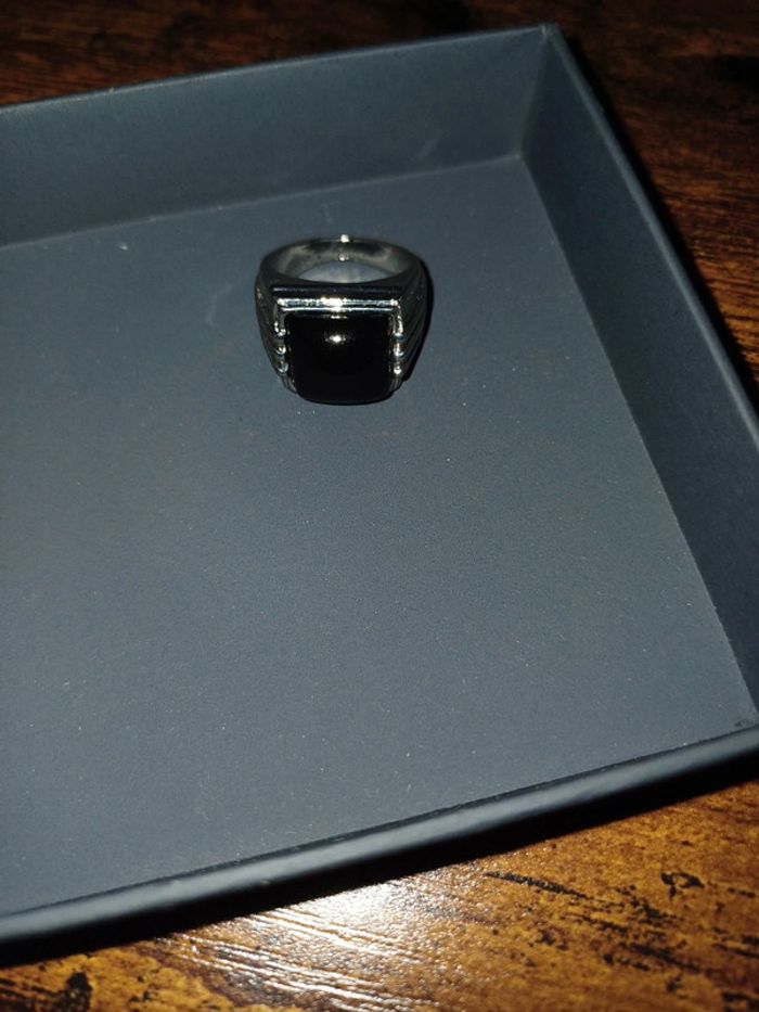 Bague en métal argenté et cabochon noir en plastique taille 56