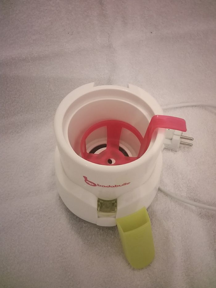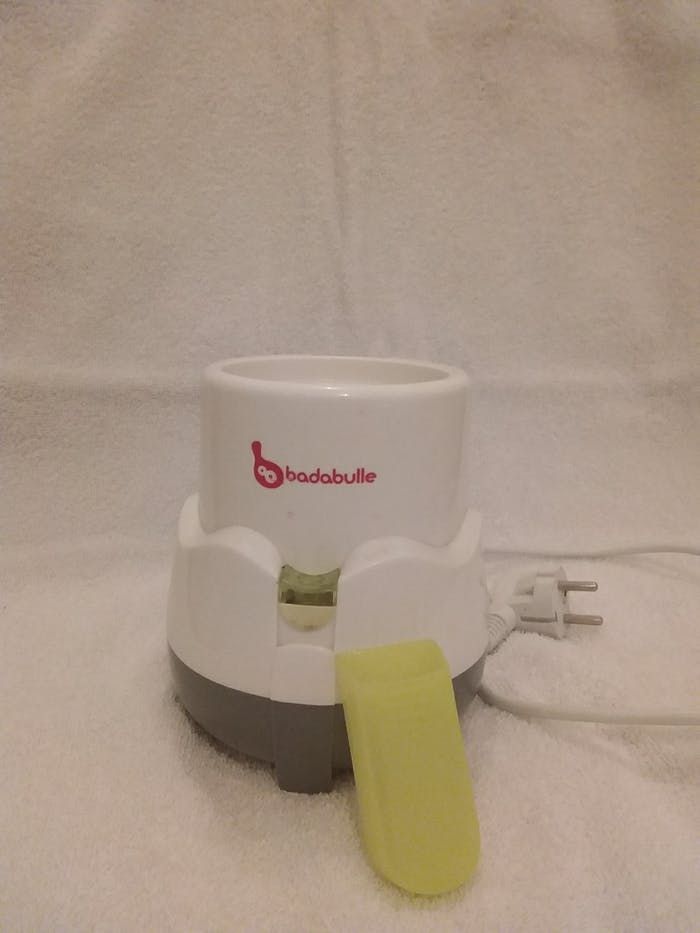 Chauffe biberon Badabulle fonctionne parfaitement bien. Dosette d'eau intégrée S'adapte aux biberons cols larges ou standards Panier pour réchauffer les petits pots