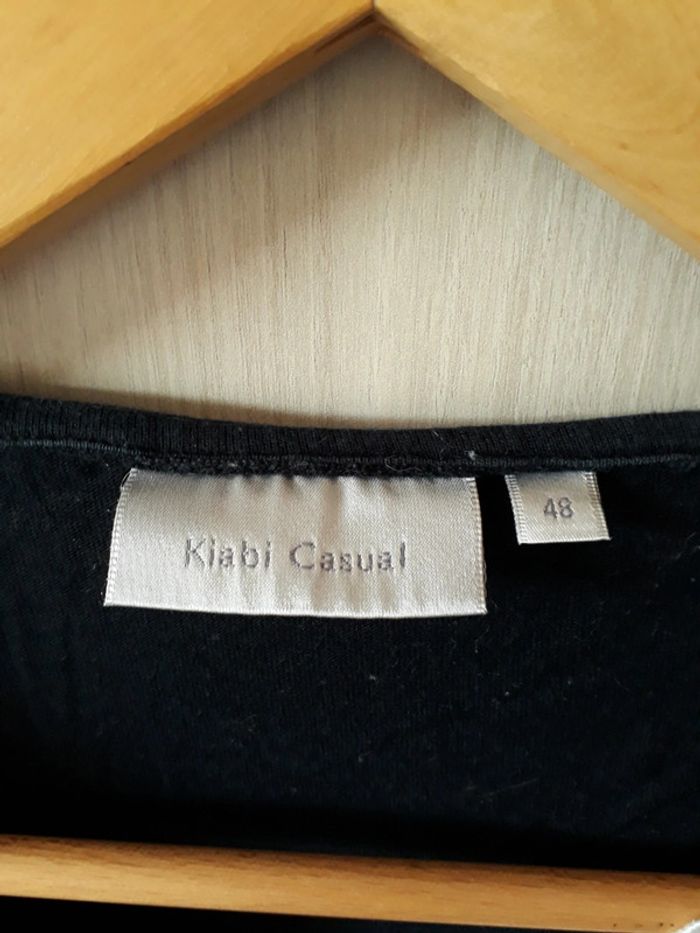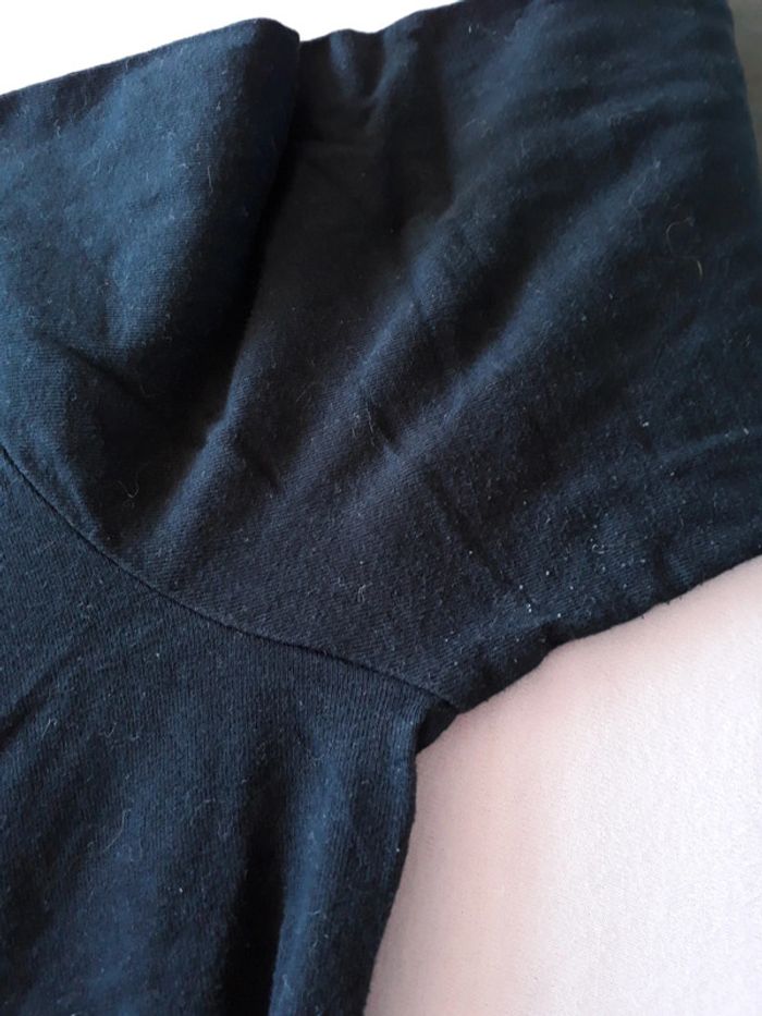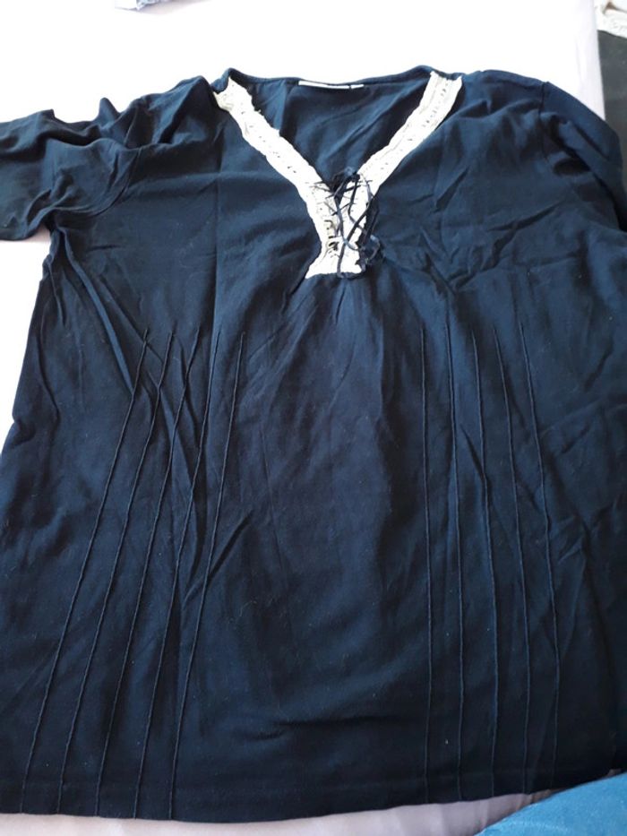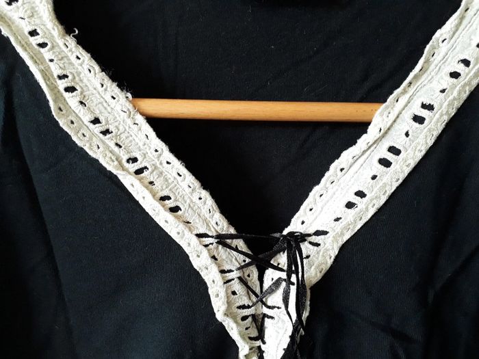 Tunique noire en coton avec encolure en broderie ajourée et lacet en satin, manches 3/4 Bon état mais petites bouloches aux aisselles Largeur épaules 44cm, largeur entre aisselles 57cm sans étirer, bas 62cm, longueur 66cm #lavinia02taille48 Dernier prix pas de remise en lot