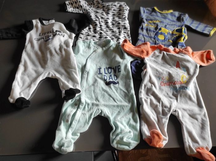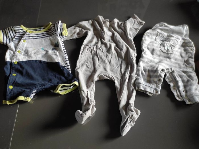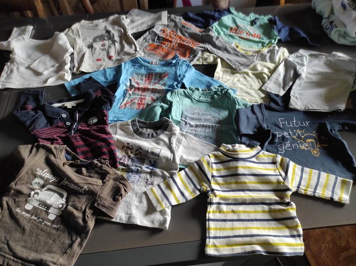 Lot vêtements en 3 mois Très bon état 13 t-shirt manches longues 3 t-shirt manches courtes 2 pulls 10 pantalons 1 short 5 pyjamas épais + 1 fin 1 salopette été et 1 hiver Marque grain de blé Kiabi Kitchoun ... Photo possible sur demande