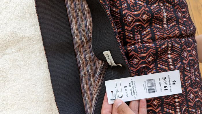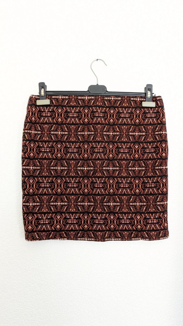 Jupe courte à motif ethnique stretch Marque cache-cache Neuve avec l'étiquette, prix 19,99€ Longueur 45 cm Largeur 41 à 47 cm (taille élastique)