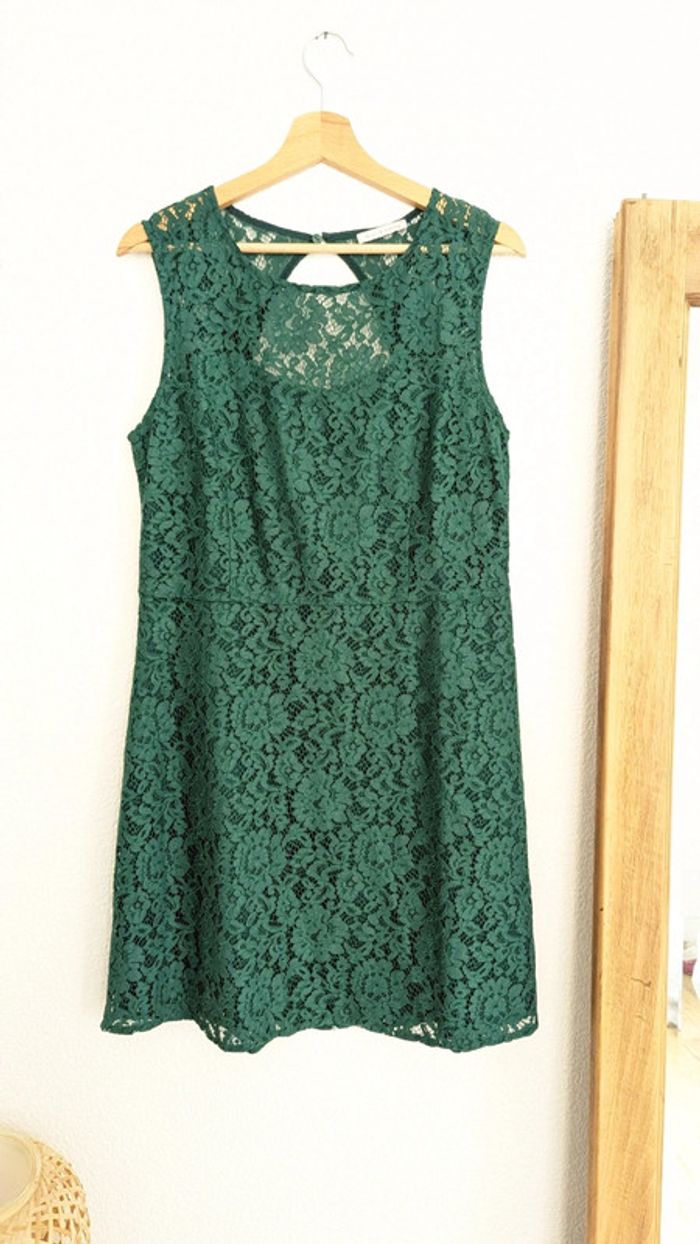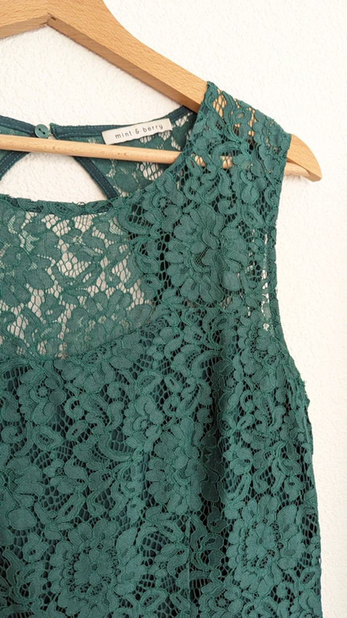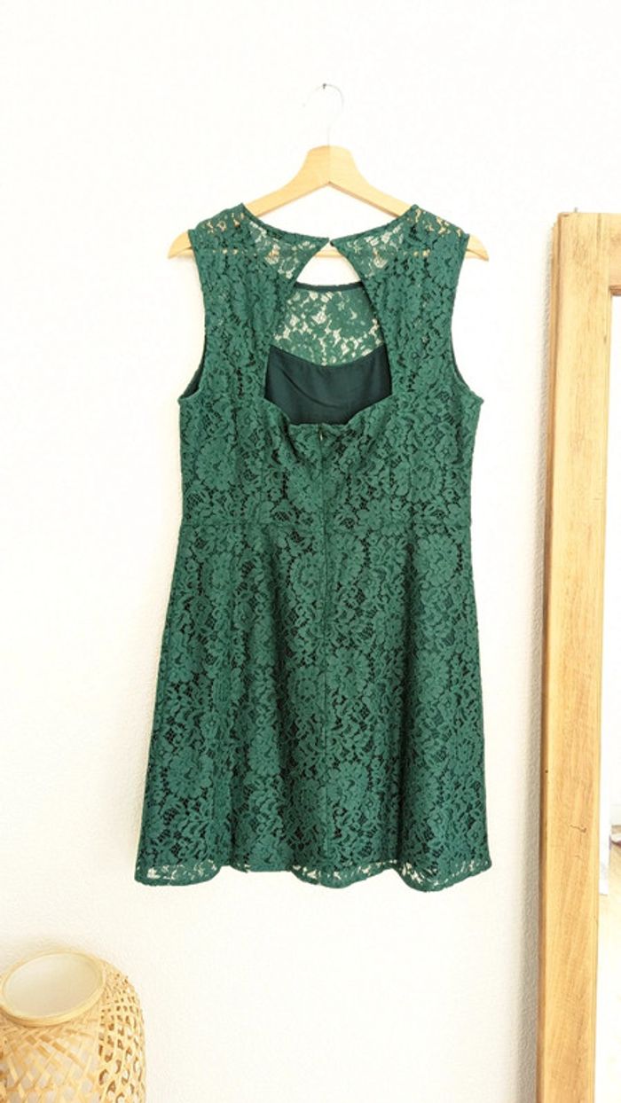 Robe en dentelle verte avec dos ouvert Marque Mint and Berry Longueur 90 cm Largeur poitrine 49 cm Portée une seule fois pour un mariage