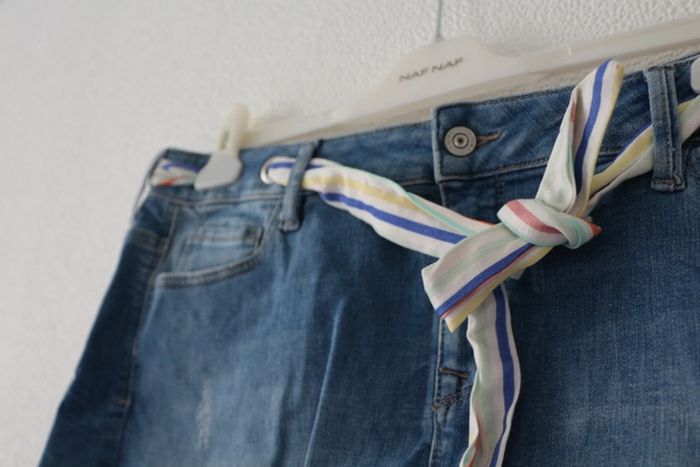 Mini jupe en jeans avec ceinture en tissu à rayures colorées Marque EDC (Esprit) Largeur 44cm Longueur 37cm Neuve