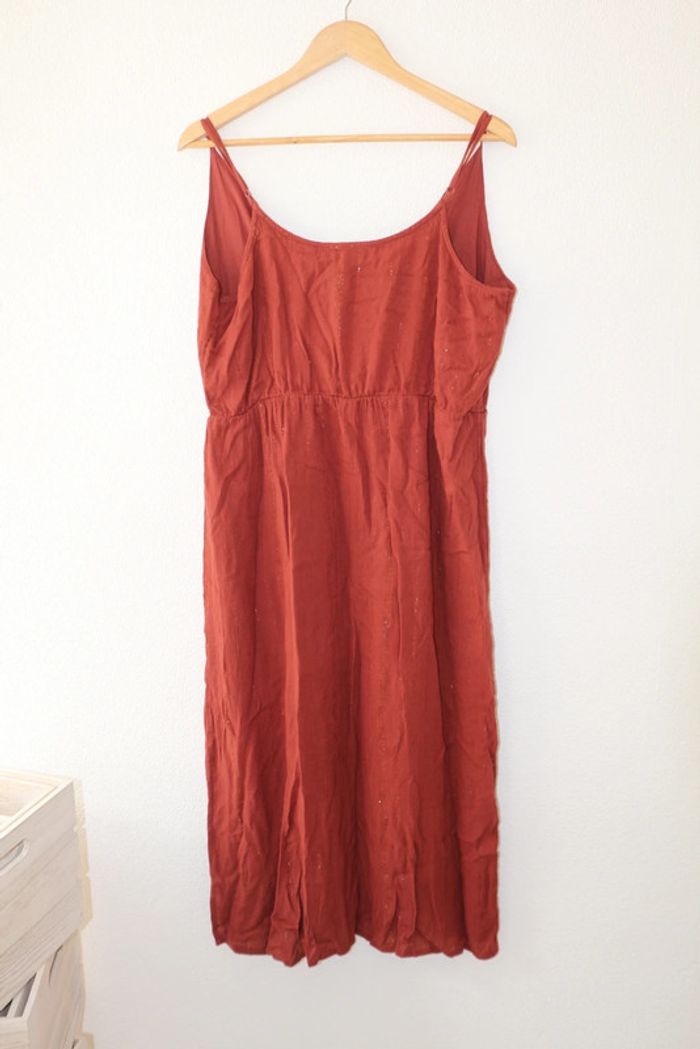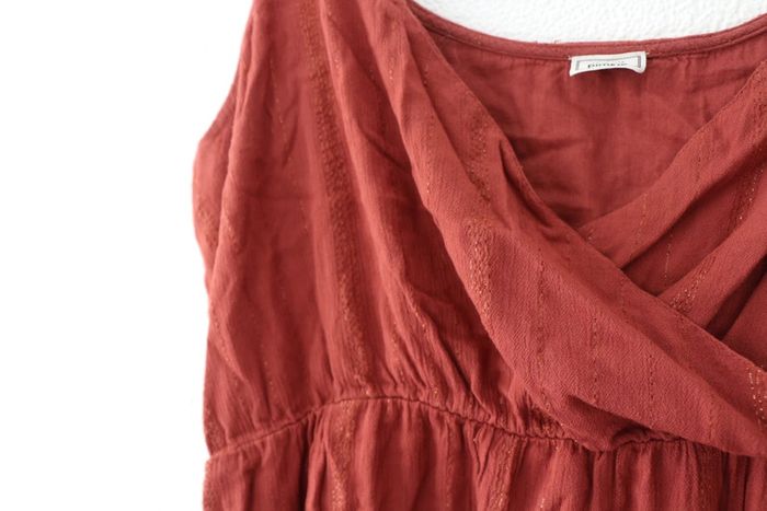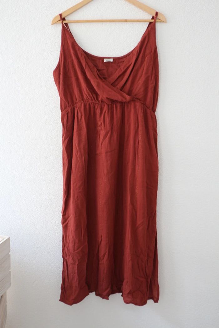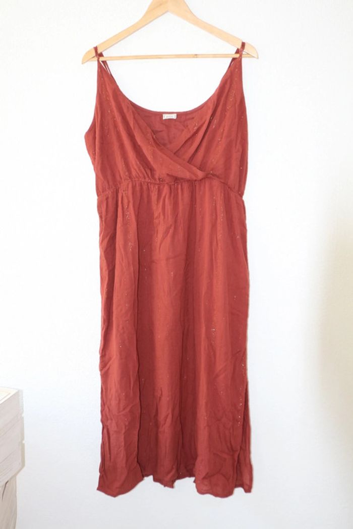 Robe longue forme cache cœur sur la poitrine Couleur entre marron et rouille avec des fils irisés dorés Marque pimkie Largeur poitrine 51cm Largeur taille 45cm Longueur 121cm