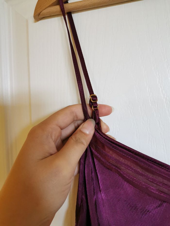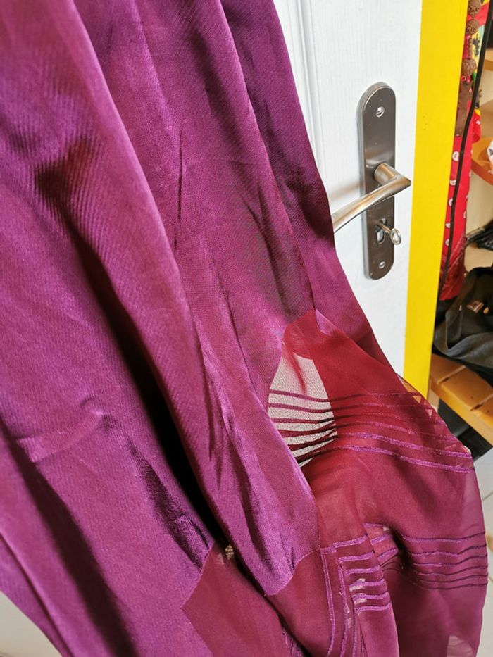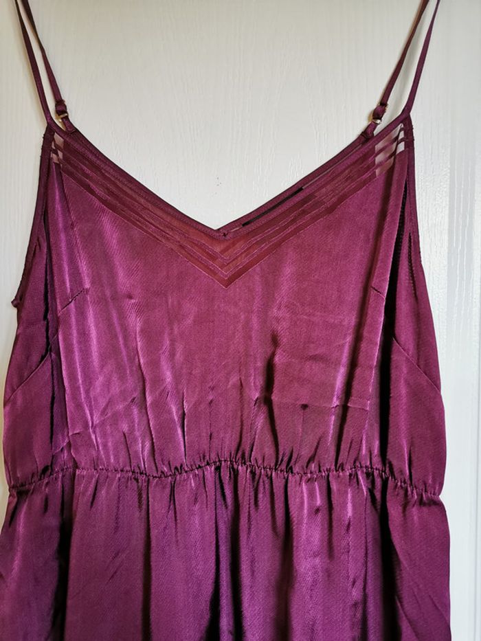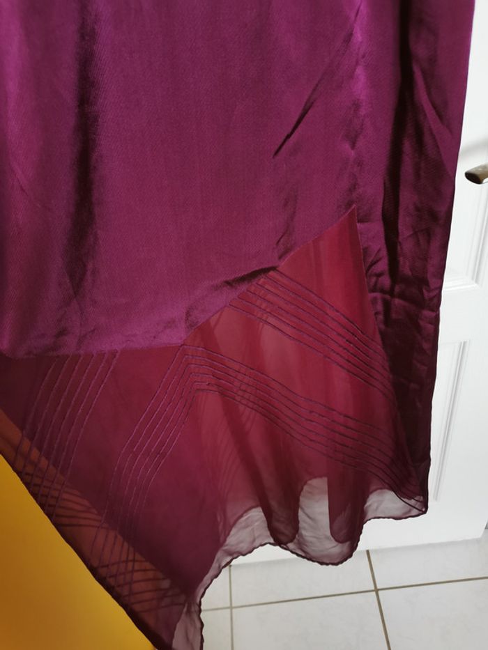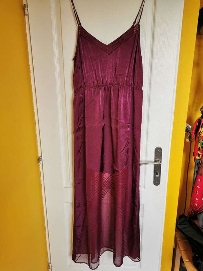 Très belle robe longue satinée H&M La couleur est entre bordeaux et violet Portée 1 fois lors d'un mariage, très joli effet Légère et agréable à porter Taille 42 Largeur à la poitrine : 45 cm Largeur à la taille : 38 cm (sans étirer l'élastique) Longueur : 151 cm