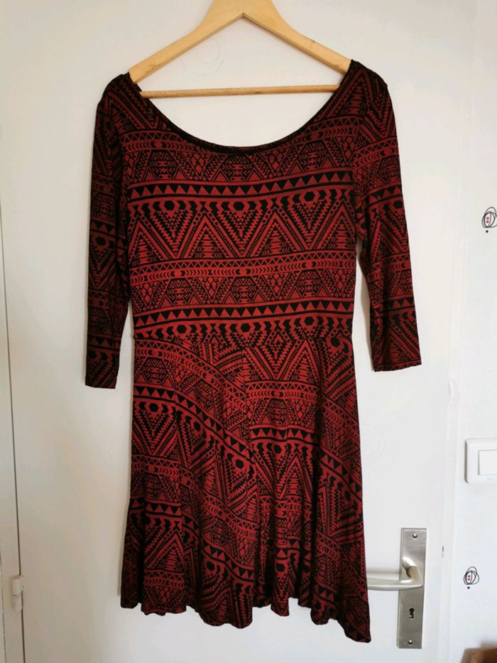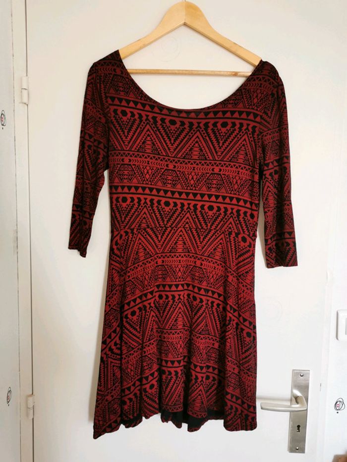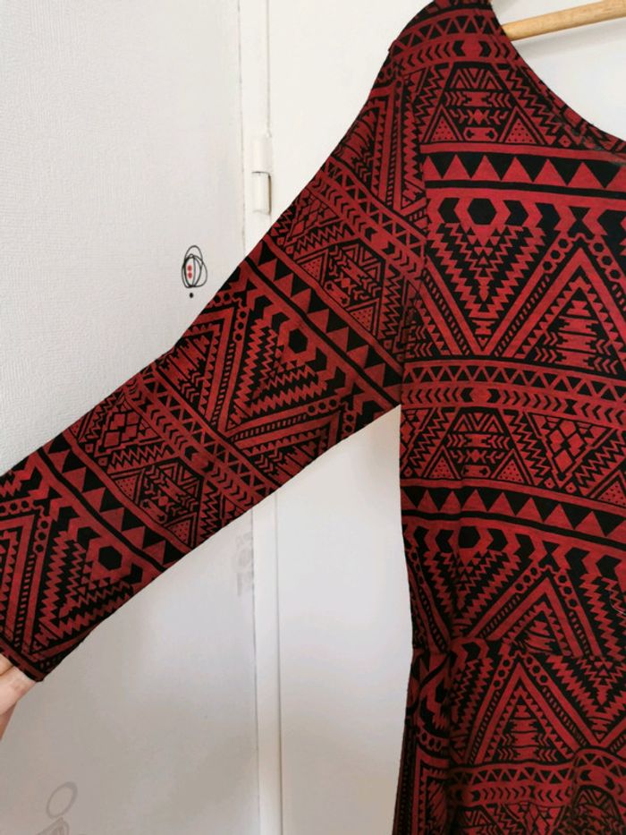 Jolie robe fluide à motifs ethniques La couleur de fond est bien bordeaux (ça paraît rouge sur les photos) Matiere un peu élastique Manches 3/4 Largeur aisselles : 45cm Largeur taille : 39cm Longueur : 86cm