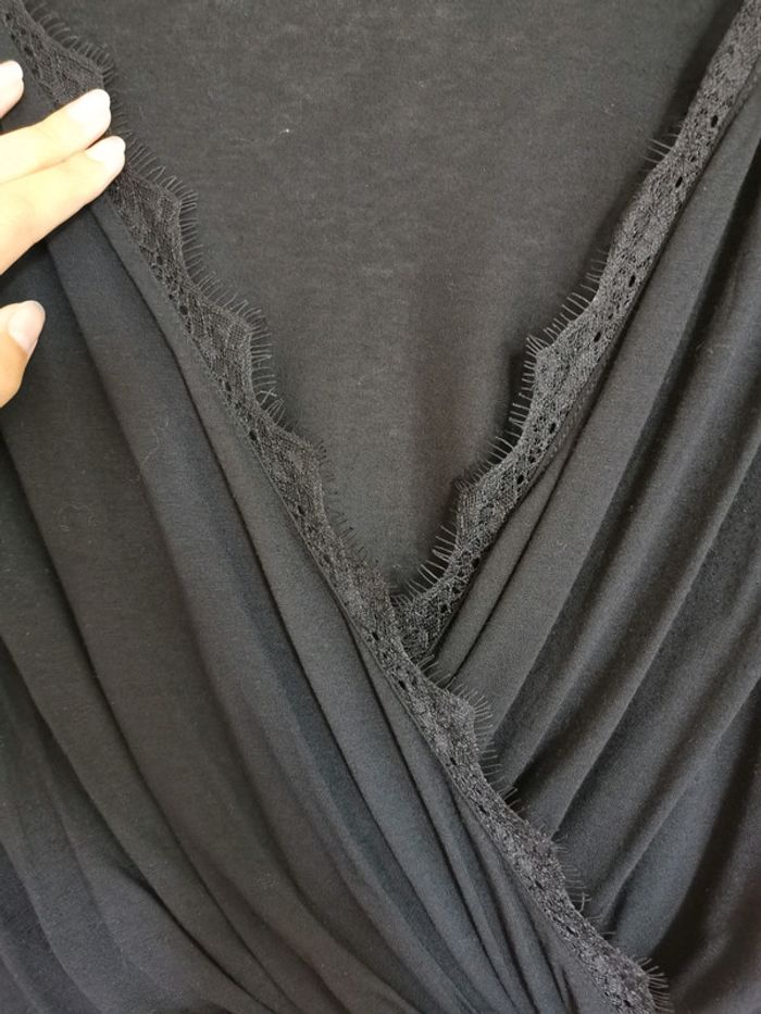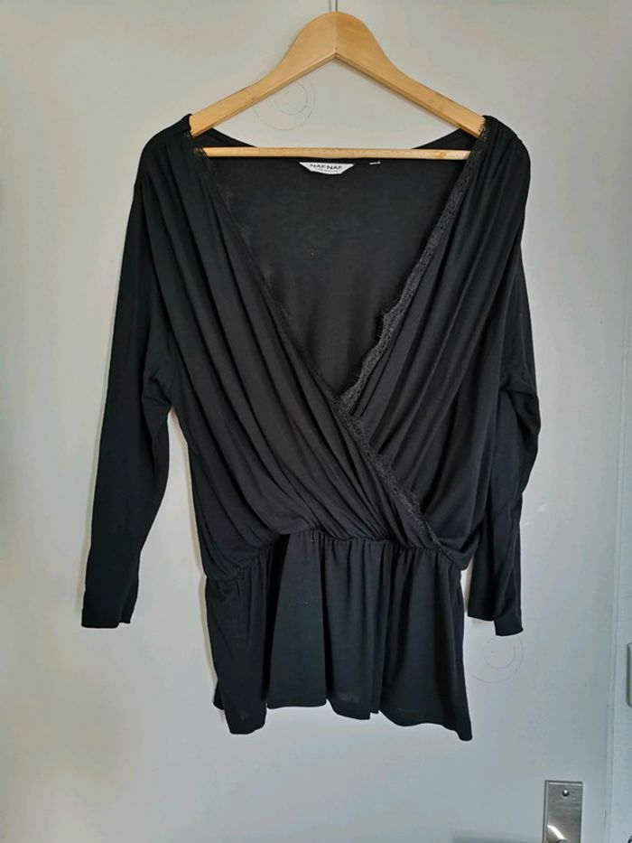 Haut cache-cœur noir avec taille élastique et dentelle sur le décolleté Marque Naf Naf Peu porté Largeur aisselles : 47cm Largeur taille : 33cm sans étirer et 50cm en étirant au max Longueur : 68cm