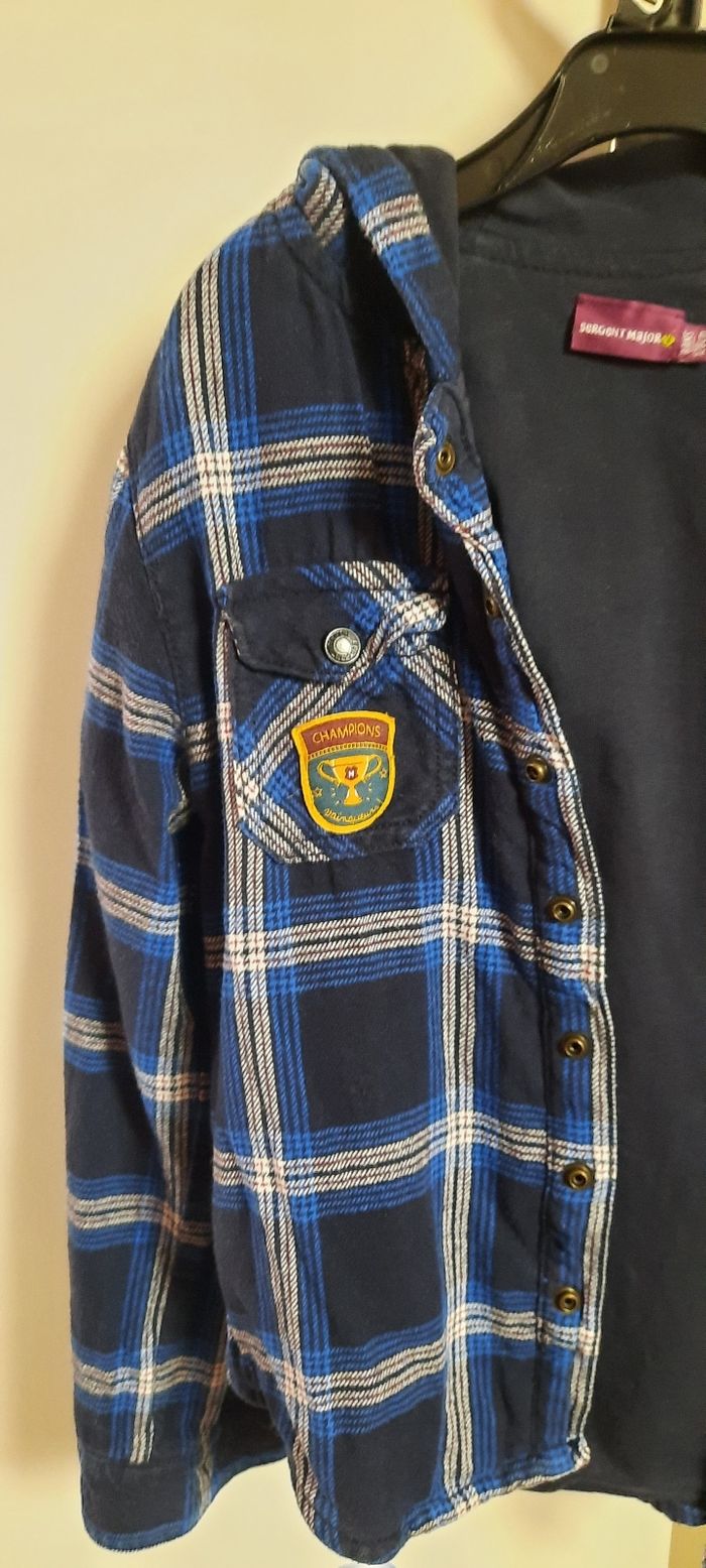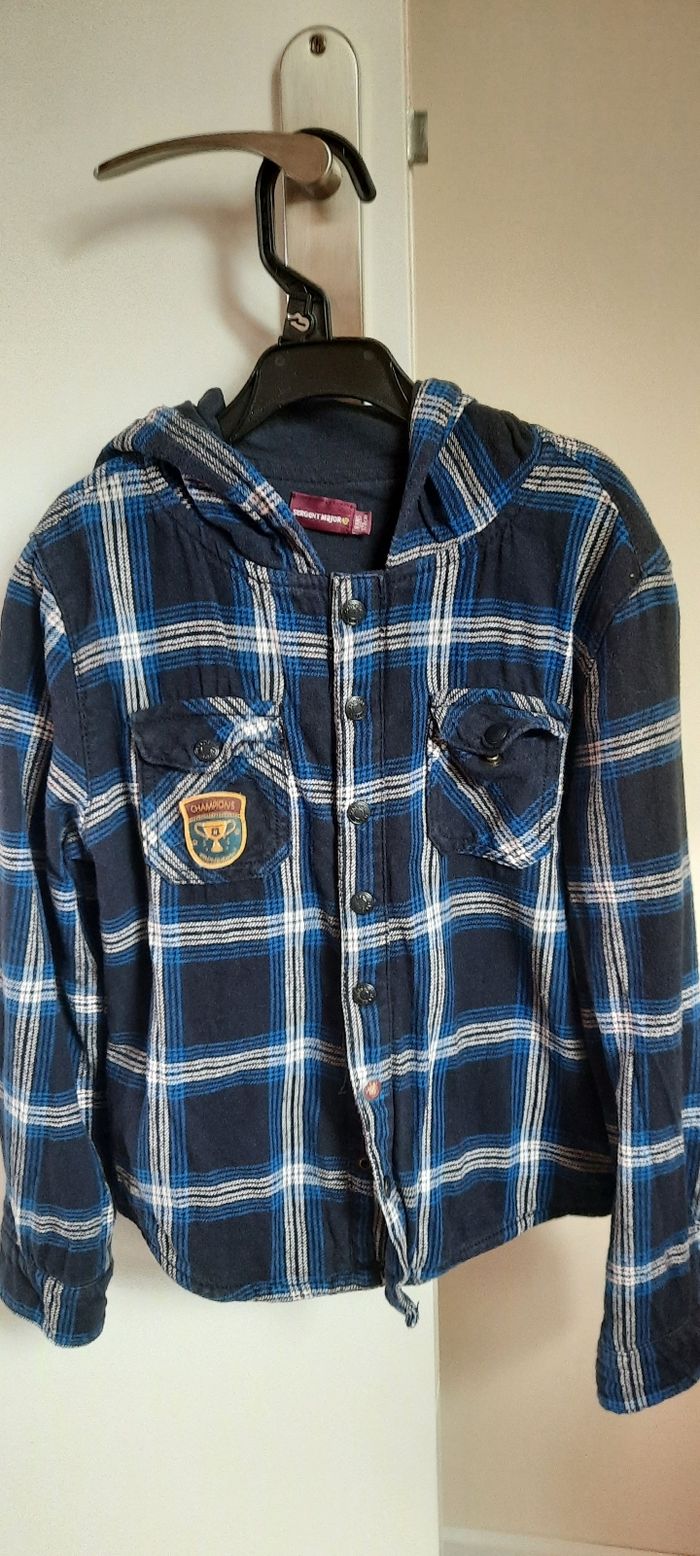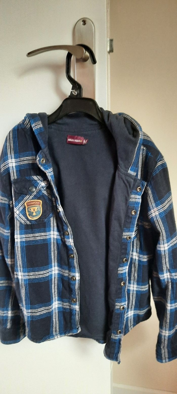 Veste garcon à capuche sergent major taille 8 ans/128 cm en très bon état, peu portée. 2 poches au niveau de la poitrine, boutons pressoir sur le devant et au niveau des manches. Veste 100% coton, doublure 100% coton.
