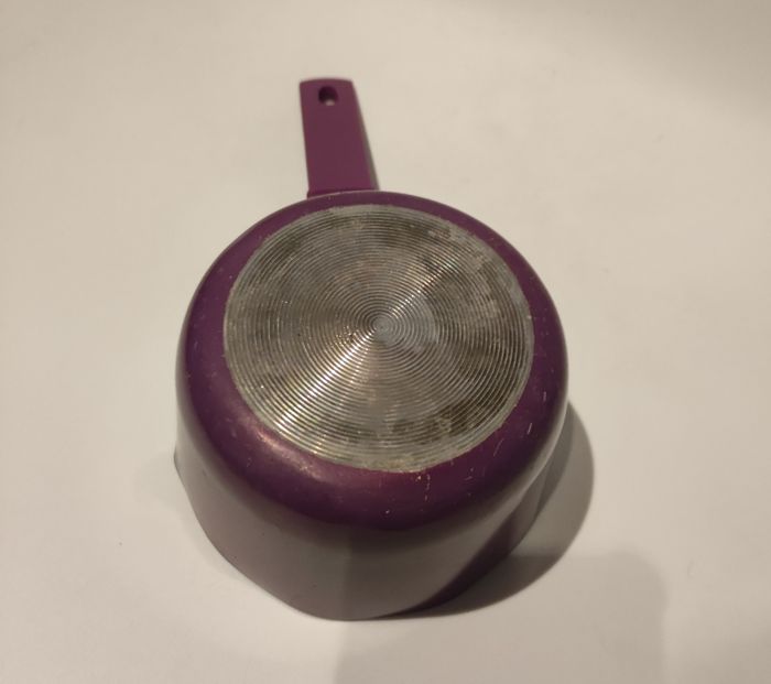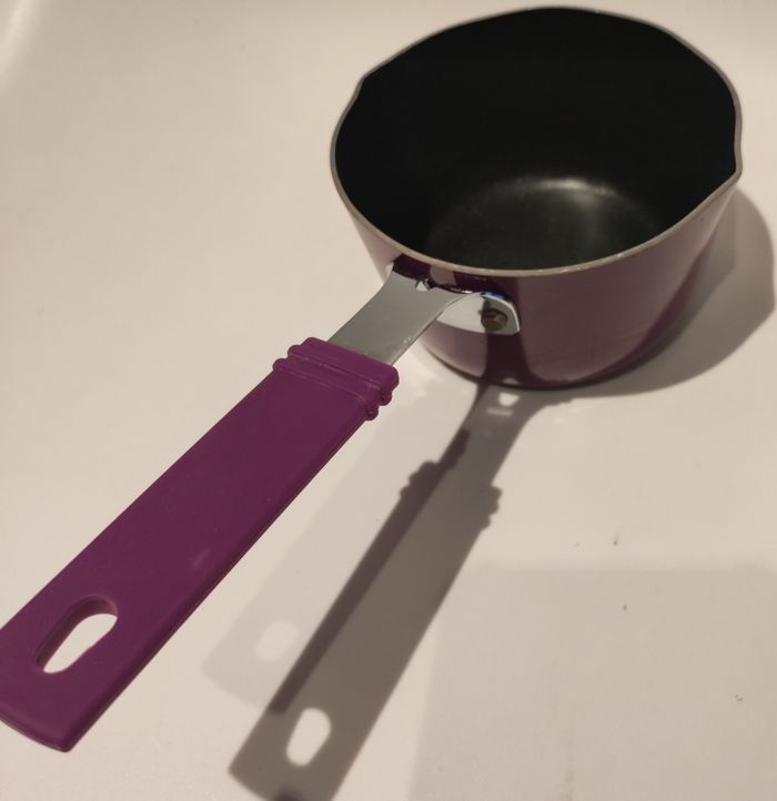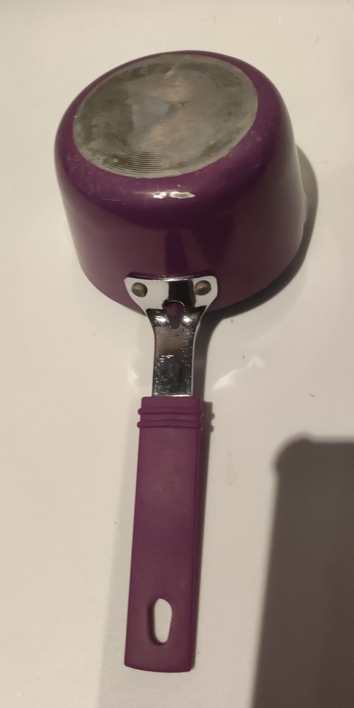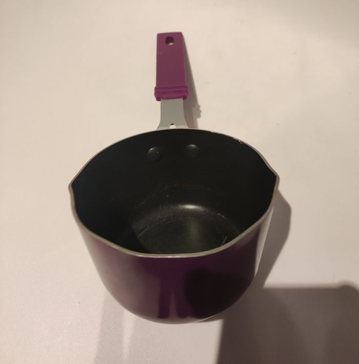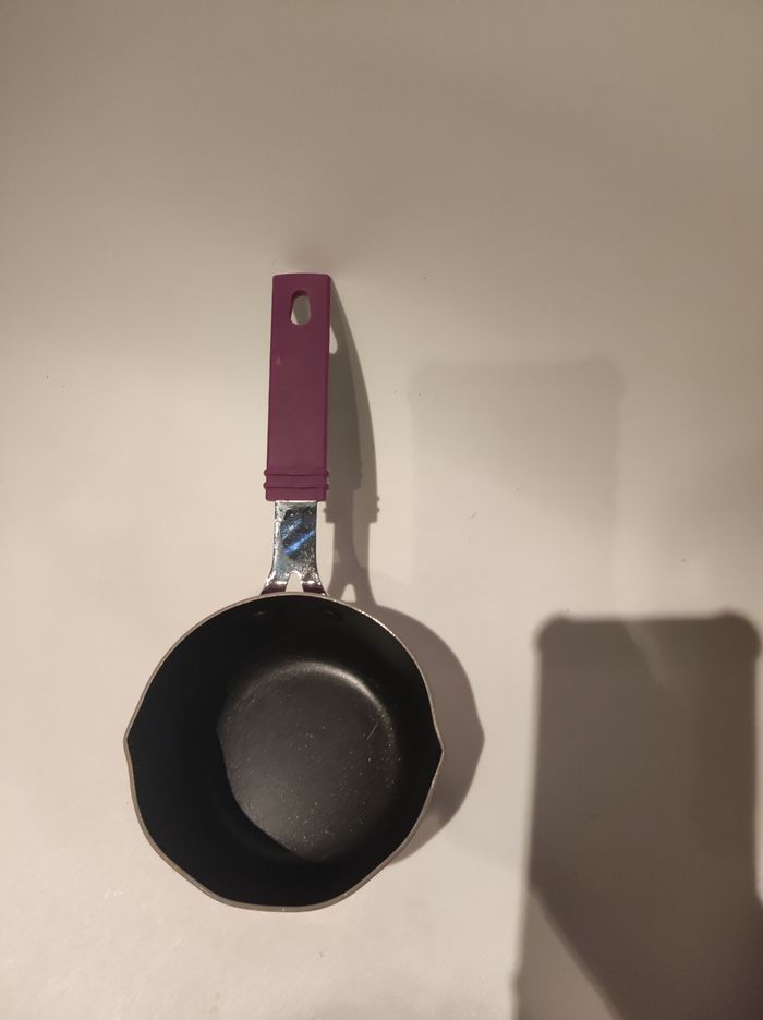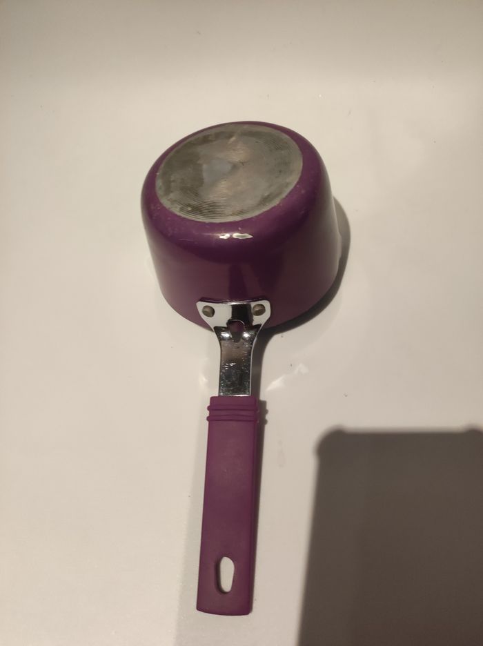 Petite Casserole pour cuire les sauces (tomate, béchamel...) Ou le lait. Elle mesure 26 cm de long (avec encoche pour la suspendre) et 10,5 cm de diamètre. Elle est en fonte dalu a l intérieur métal a l'extérieur avec manche recouvert de plastique. Couleurs violettes. Juste une marque sur le dessous sinon parfait état.