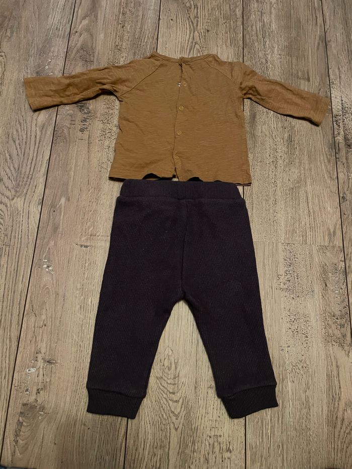 Ensemble avec haut manches longues et pantalon marron, en très bon état. Marque : Kiabi Taille : 6 mois