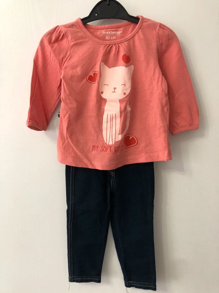 Ensemble bébé fille composé d'un haut manches longues et d'un pantalon style legging Motif chat Marque In Extenso Taille 12 mois, 80cm #elmomo57_fille12mois #elmomo57_fille