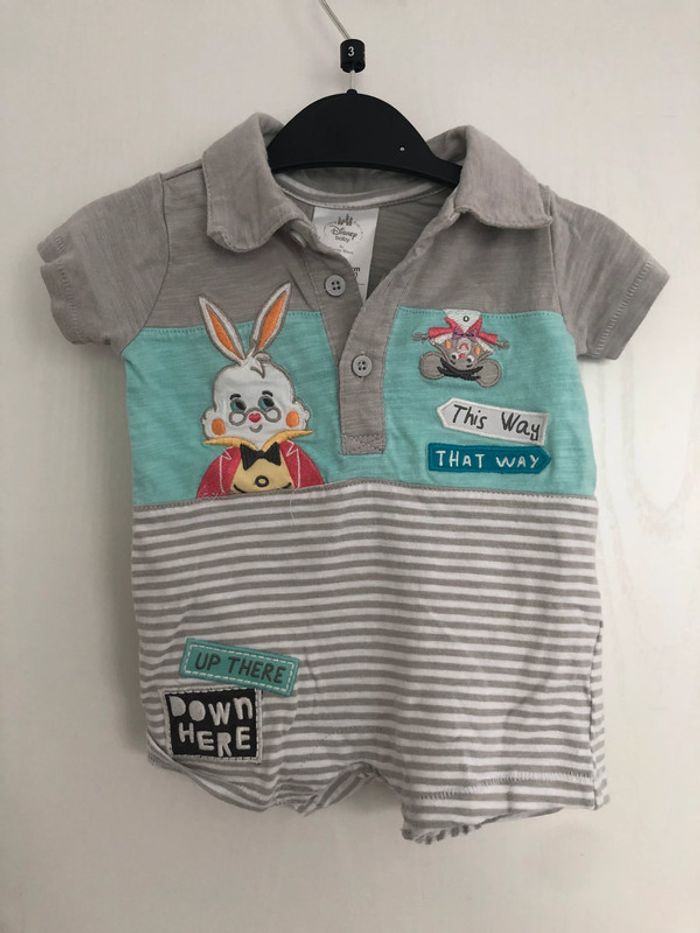 Très jolie combishort manches courtes avec ouverture à l'avant et sur le bas. Motif lapin d'Alice au pays des Merveilles Marque Disney Taille 0-3 mois, 62 cm #elmomo57_garçon3mois #elmomo57_disney #elmomo57_garçon