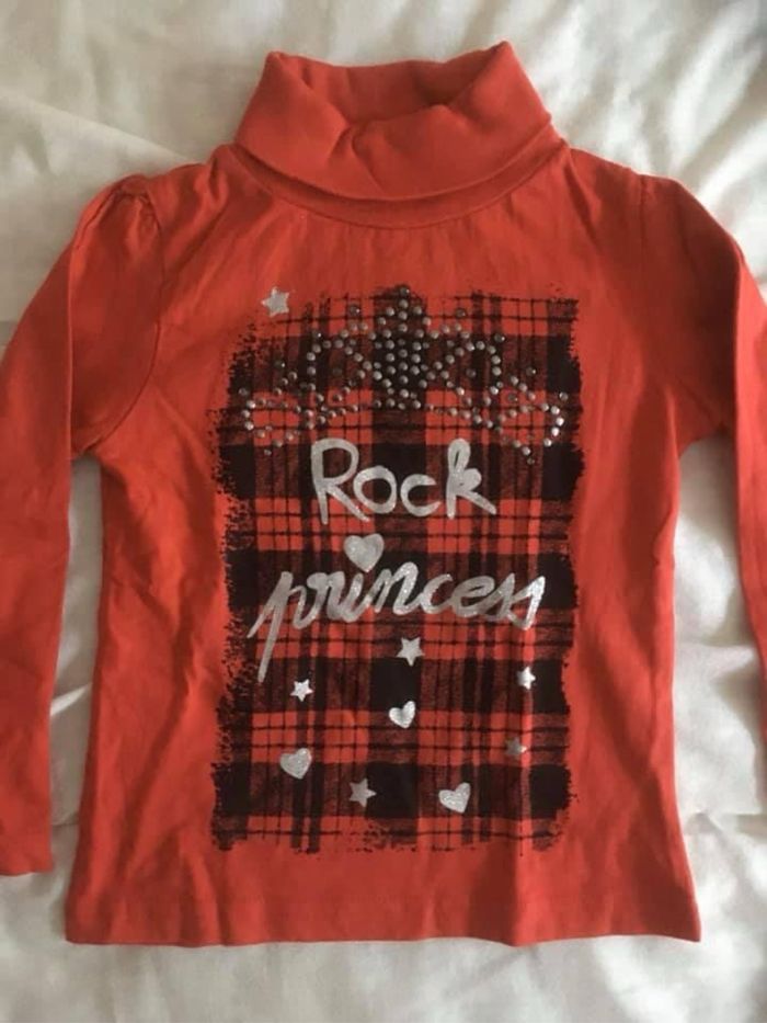 Sous-pull Punkidz (état neuf), taille 3/4 ans, vendu 2€ ~ Coloris rouge + foncé en réel, motifs « couronne » en relief + autres motifs gris pailleté et argenté.