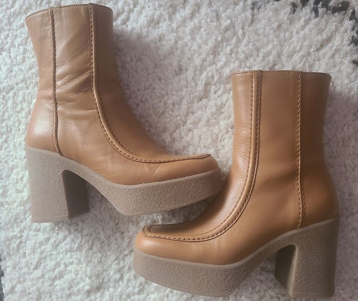 Bottes Minelli Cuir - Taille 37, neuves Bottes couleur camel, plateforme très confortable, se porte avec tout, Ligne tracées sur la botte, effet très élégant qui elance. Modèle ne se trouve plus en commerce, Informations dimensions voire photos. #bottes #boots #minelli #cuir #bottesfemmes37 #camel couleur