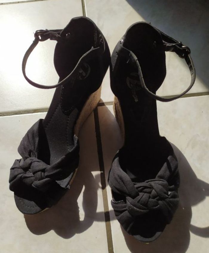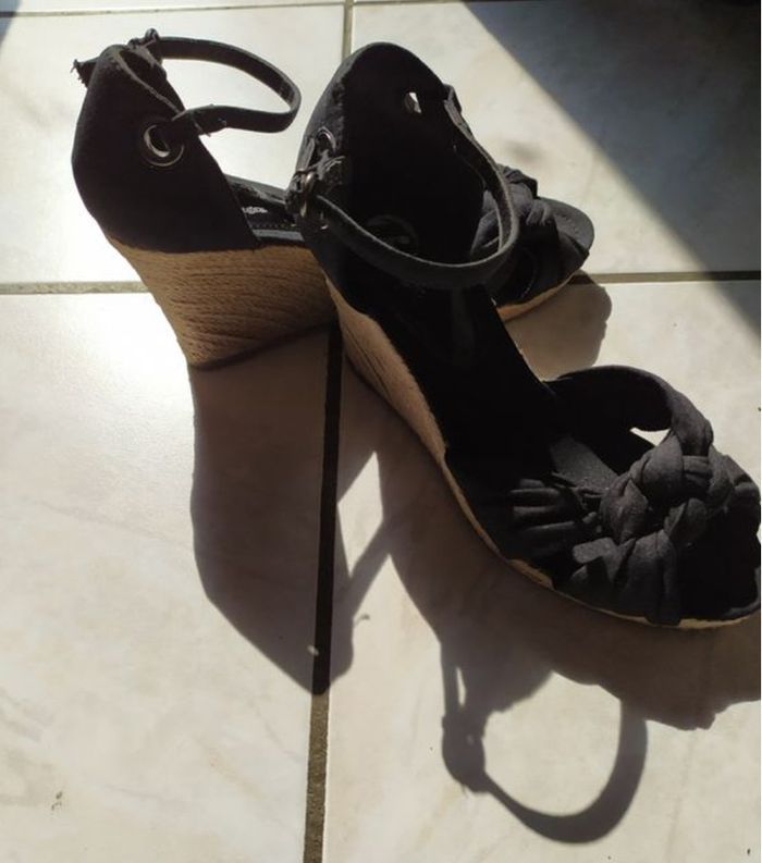 Vends paire de chaussure compensé de la marque Bata. En tissu, sangles réglables à la cheville ,talon compensé en corde . Pour plus d'informations n'hésitez pas à me contacter . 39·Très bon état·Bata La livraison peut se faire en main propre .