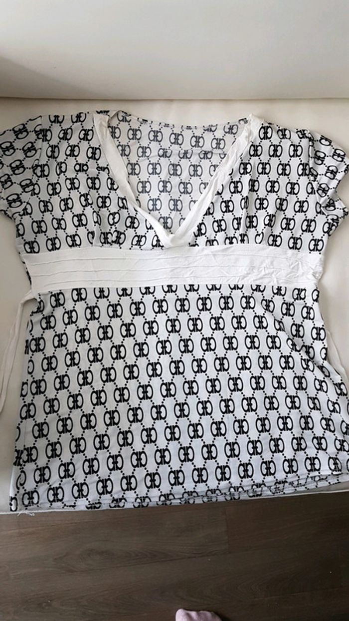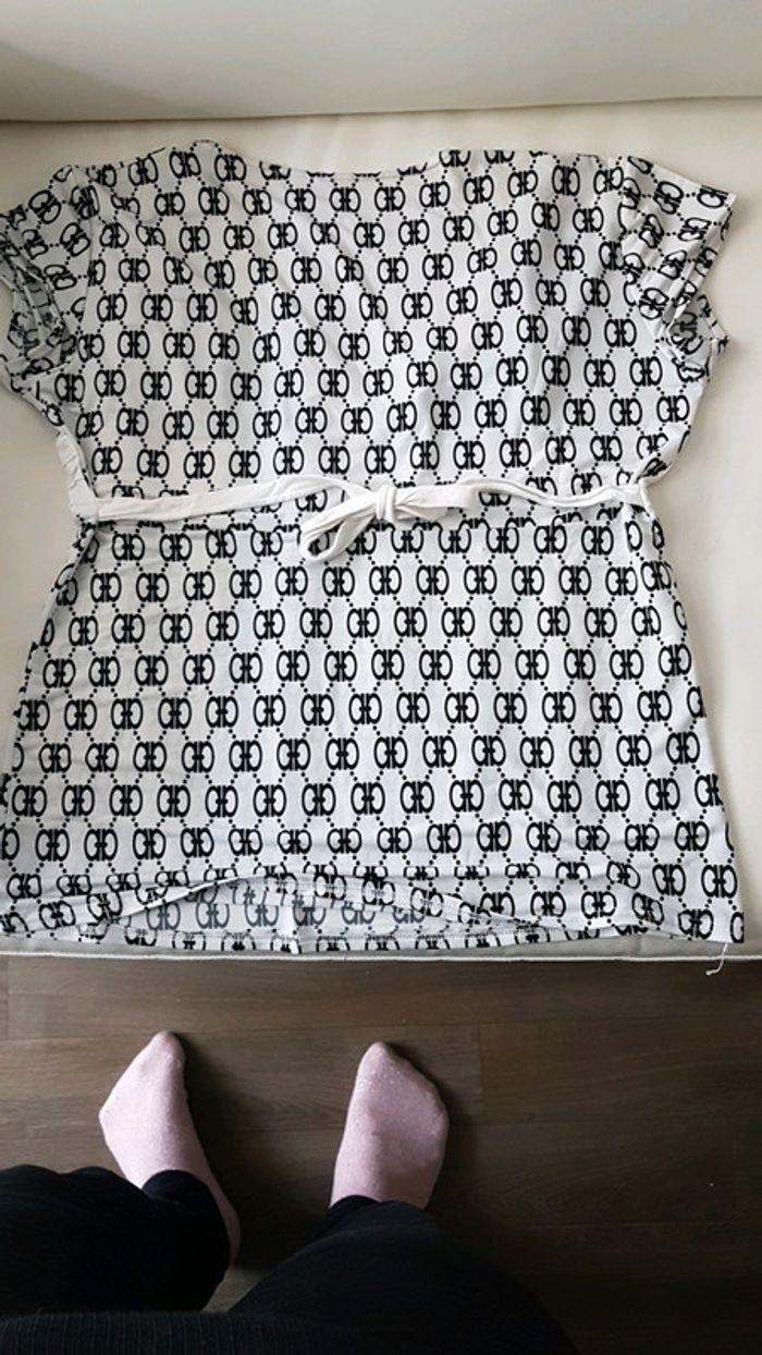 T-shirt manche courte femme, couleur blanc motif noir. Taille L/XL. #manchescourtes #tailleL #tailleXL #femme #fille #été #hautfemmeprescou20