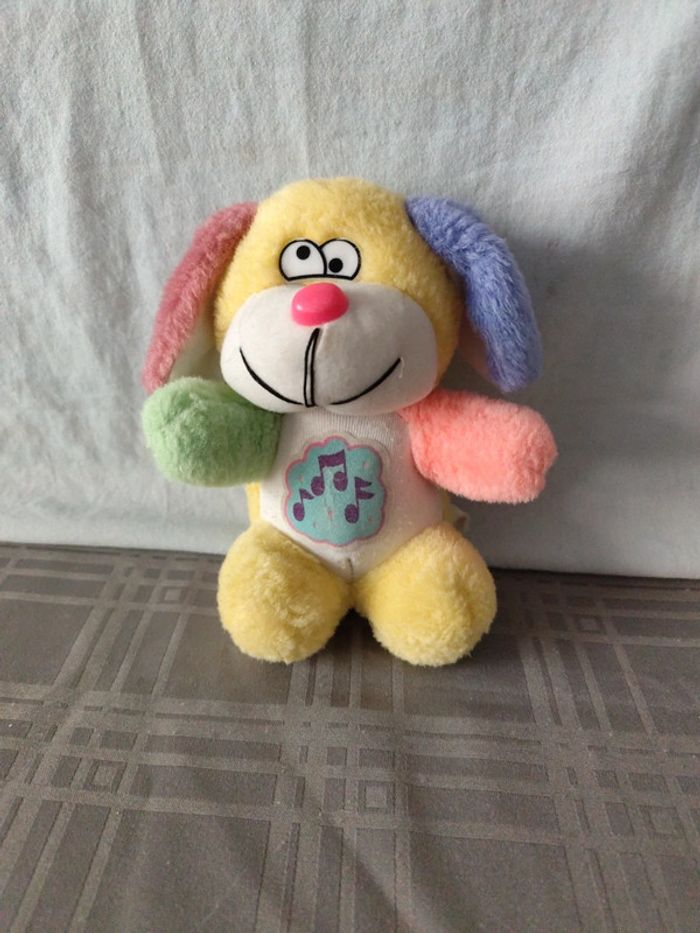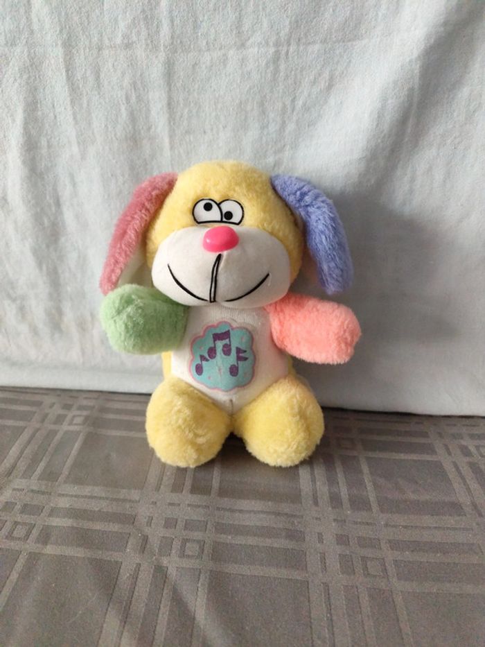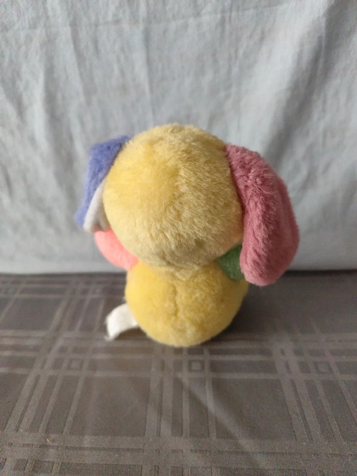 Peluche chien multicolore jaune vert orange rose violet 18 cm