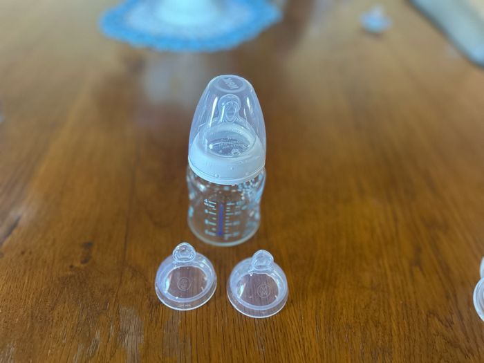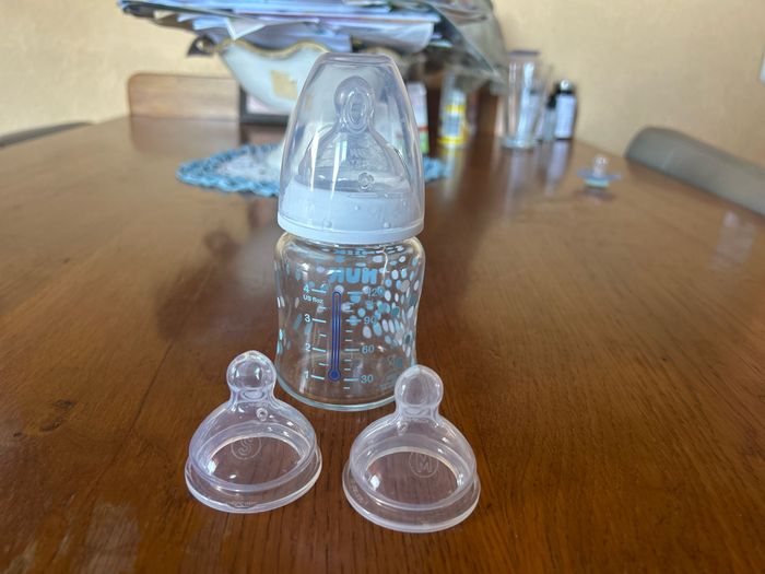 Bonjour, Je mets en vente un biberon Nuk First Choice avec ses tétins (deux tétines taille S et une tétine M) Il est comme neuf, utilisé une fois car bébé n’aimait pas la forme de la tétine.