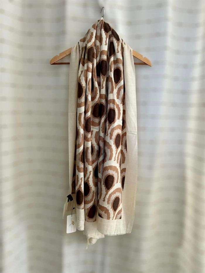 Foulard en viscose de qualité supérieure. Coloris beige avec motifs. Plus épais que la normale, ce foulard offre une chaleur douce et un toucher ultra agréable. Le toucher est un toucher laine. Marque Jade & Clarisse La jolie Charronnaise est une boutique d'accessoires de mode. Tout les articles sont neufs. Je n'accepte pas les offres, je vous remercie pour votre compréhension. Site web : la-jolie-charronnaise.sumupstore.com Facebook : La jolie Charronnaise Instagram : la.jolie.charronnaise