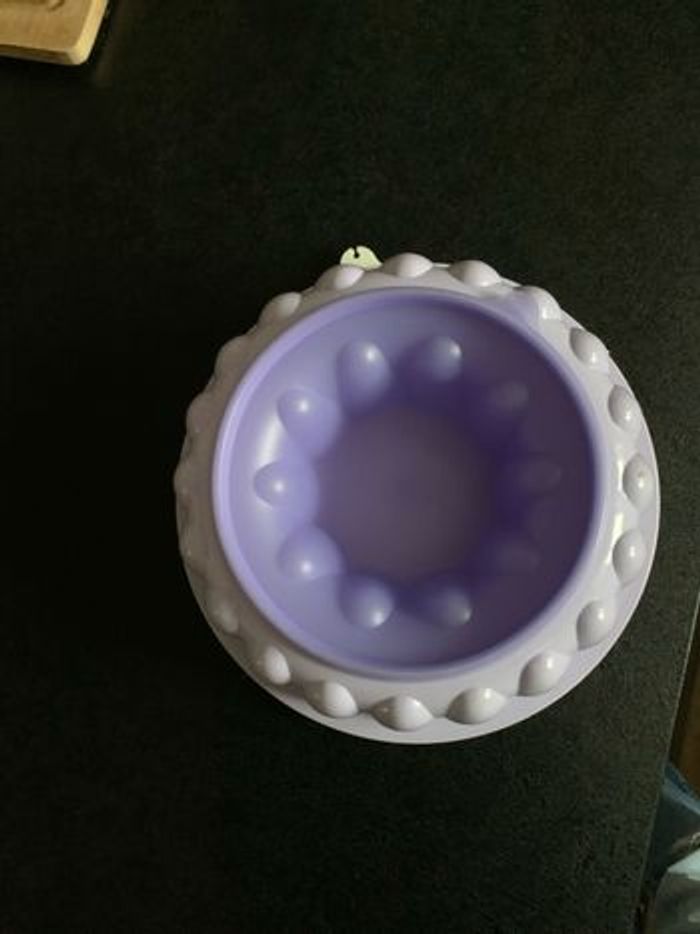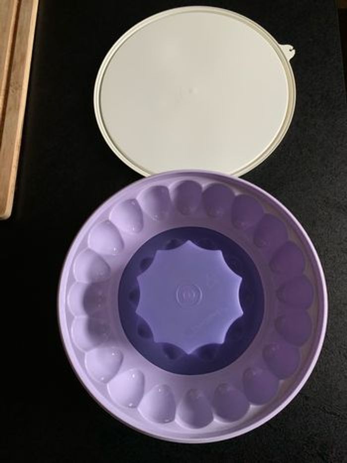 Grand moule à charlotte de chez Tupperware de couleur violette, le couvercle mesure 24 cm et le fond 17 cm