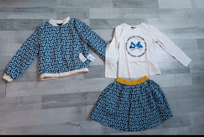 Ensemble Okaïdi 8 ans composé d'une jupe et d'un tee shirt mis quelques heures et de la veste réversible du thème neuve étiquetée acheté 60 euros possible de separer 20 euros l'ensemble et 20 la veste #revedesoleil75_8ansfille