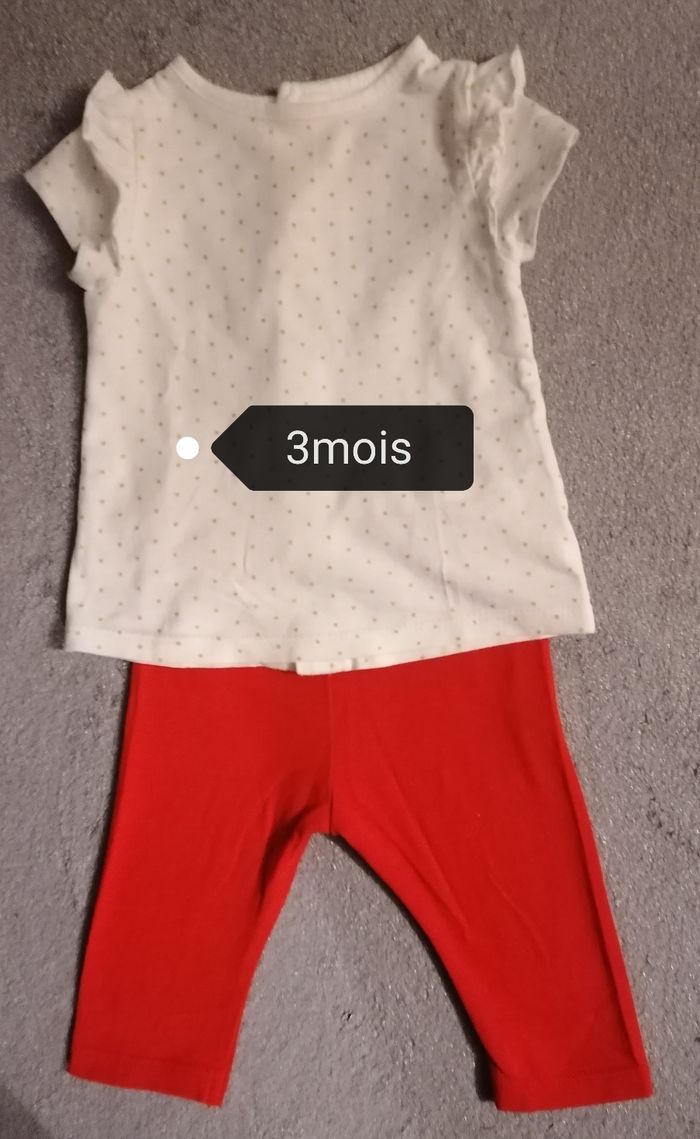 Ensemble filles kiabi 3/6mois Legging court 6mois /63-69cm rouge. Hauts 3mois /56-62cm. manches courtes, ouverture la totalité derrière, des boutons clipse. Blanc /doré Porté. 3€