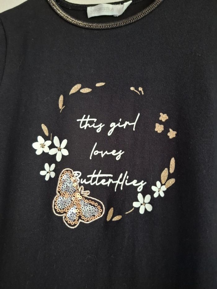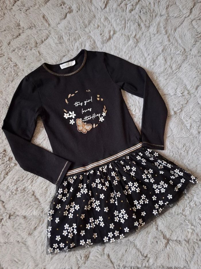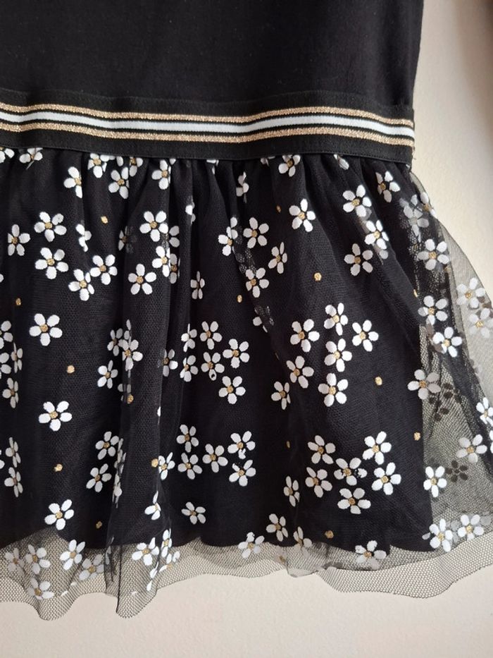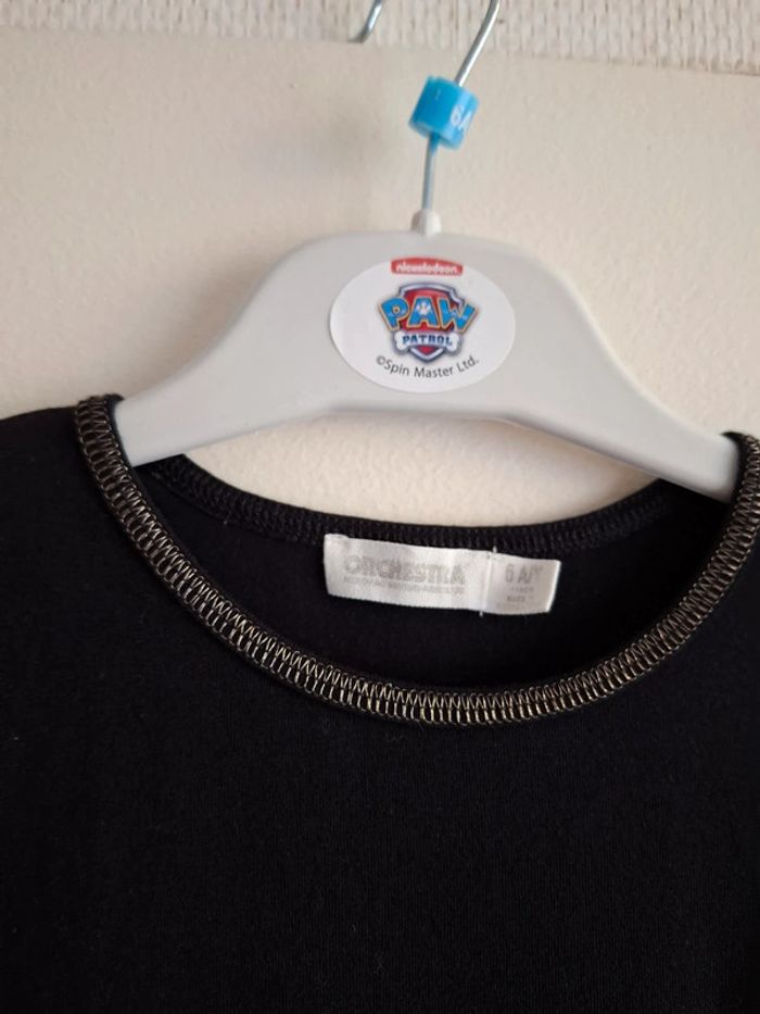 🌺 6 ans 🌺 orchestra 🌺 superbe robe bi matière , haut noir avec surpiqûres doré , motif en sequins , bas doublé avec double épaisseurs de tulle , le premier imprimé , élastique large pailleté 🌺 idéal pour les fêtes 🌺 excellent état porté quelques heures #doudou19230_6ansfille