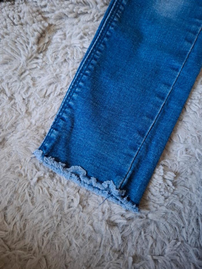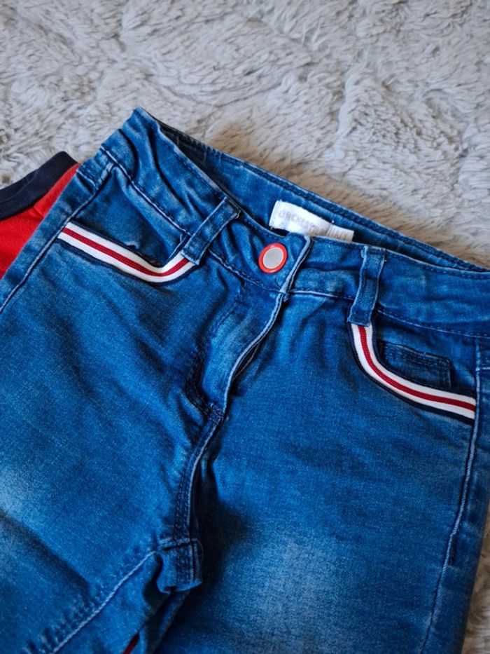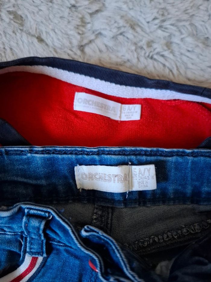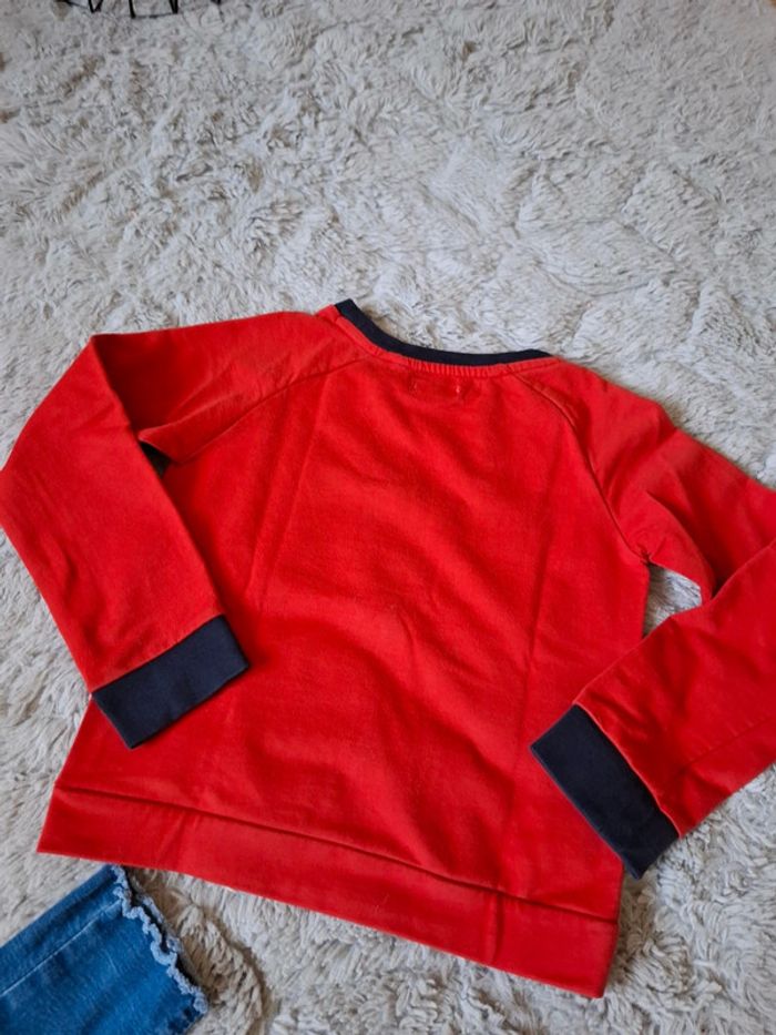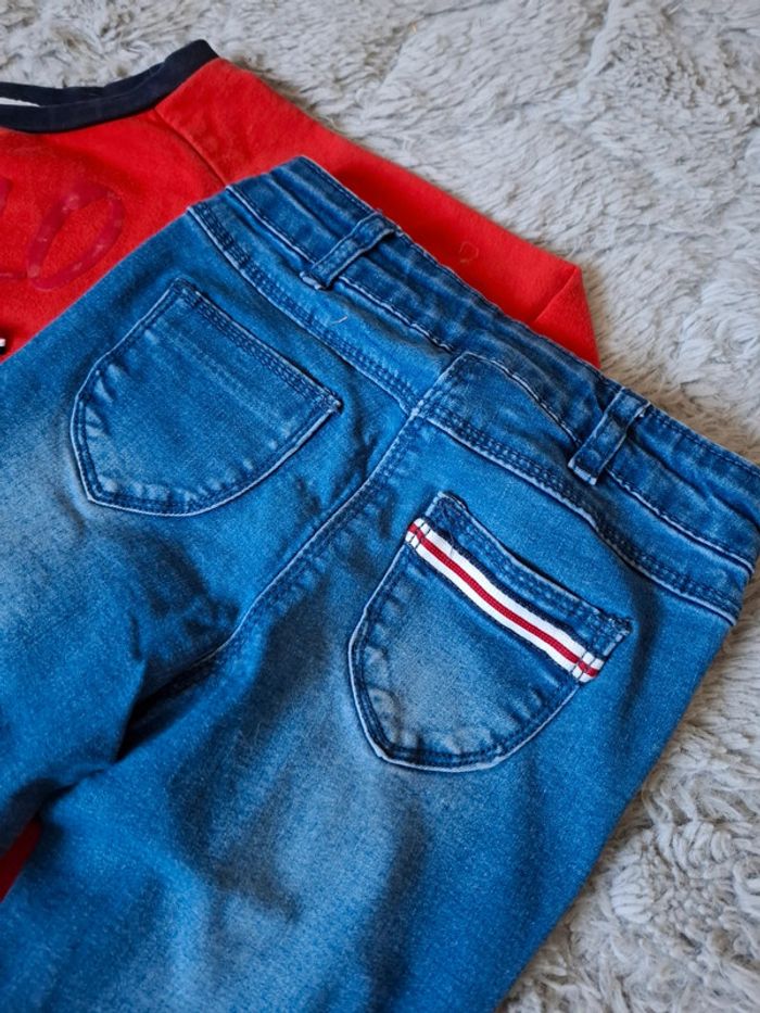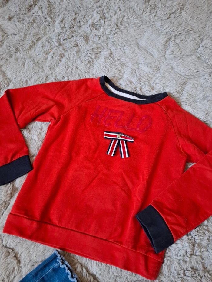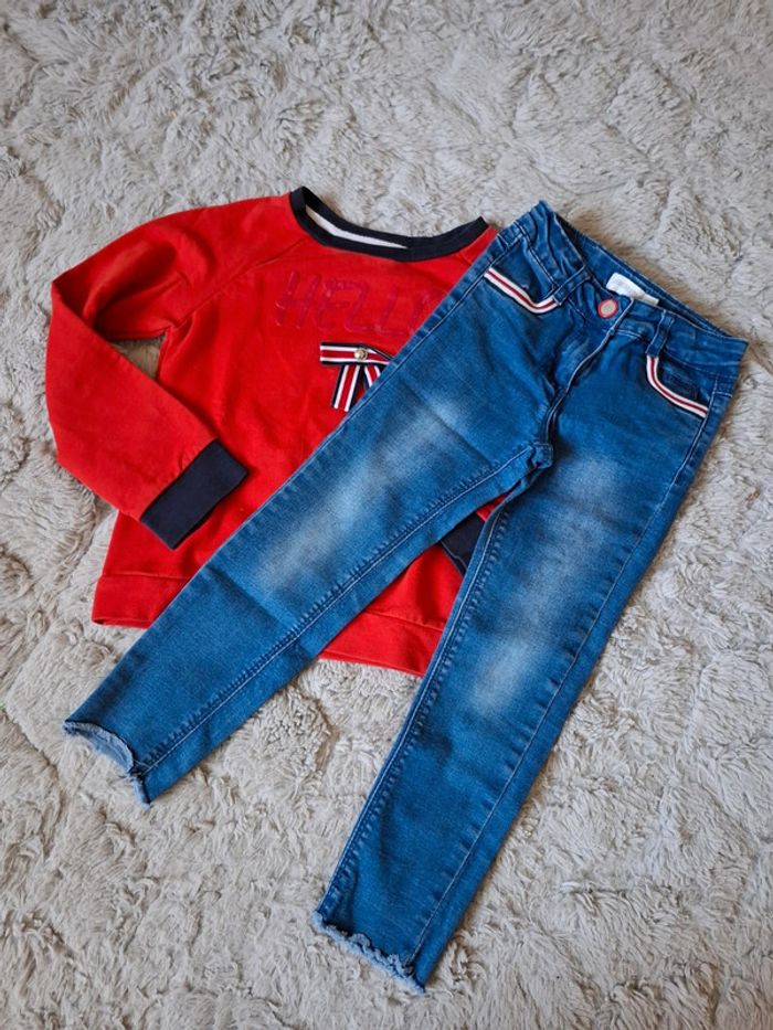 🌺 superbe ensemble jeans 5 ans taille ajustable , bas frangé , croquet sur les poches , sweat 6 ans du même thème rouge avec inscription hello et petit nœud assortie au croquet du pantalon