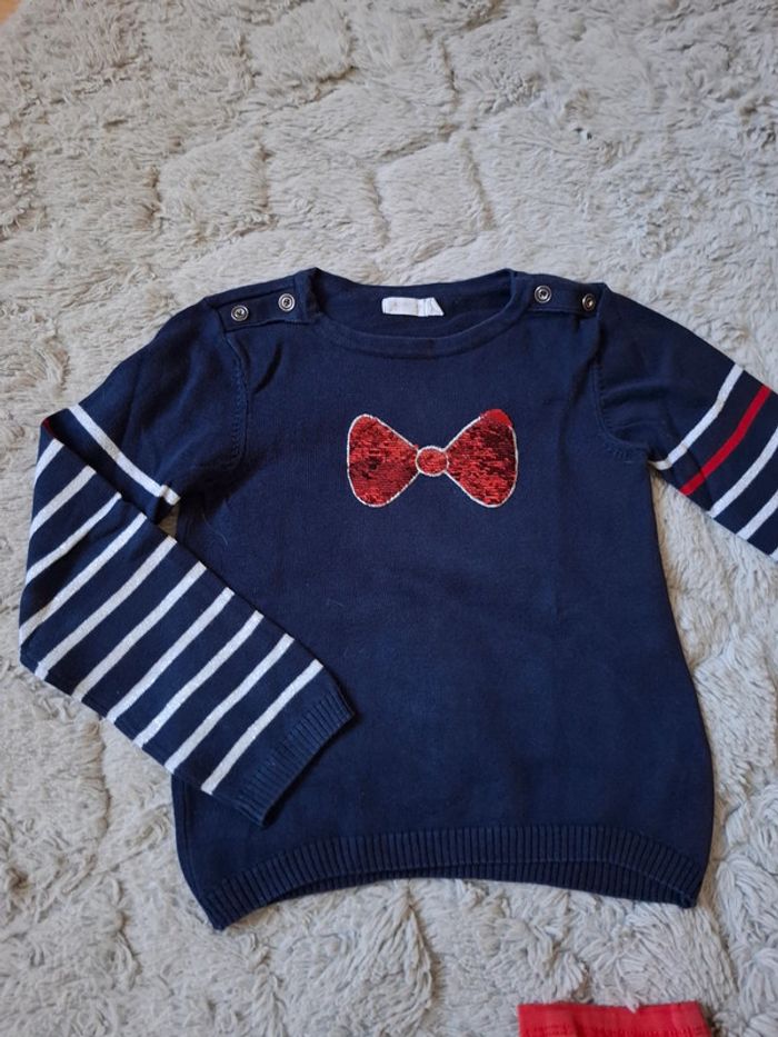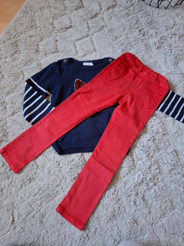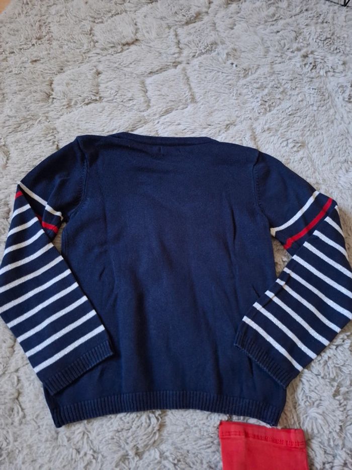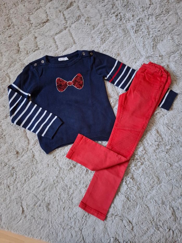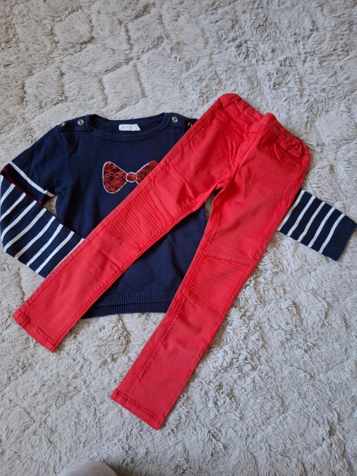 🌺 superbe ensemble jegging rouge 5 ans taille ajustable , poches marque TAO , pull en maille fine 6 ans orchestra bleu marine avec rayures argenté pailleté , un joli nœud 🎀 en sequins