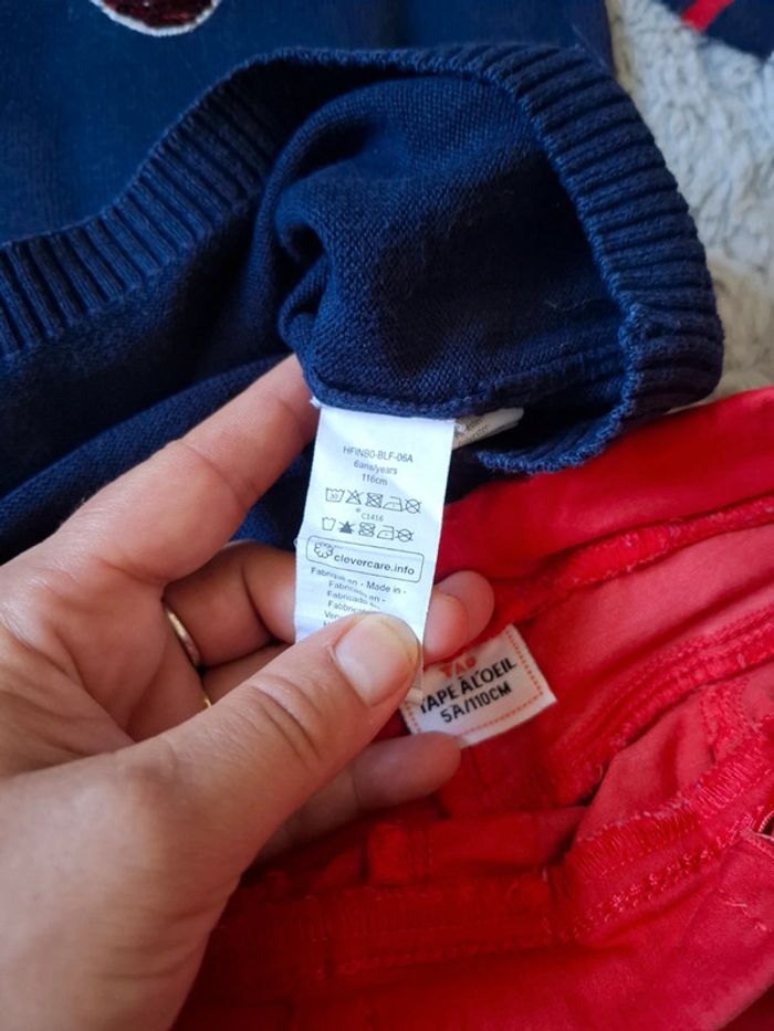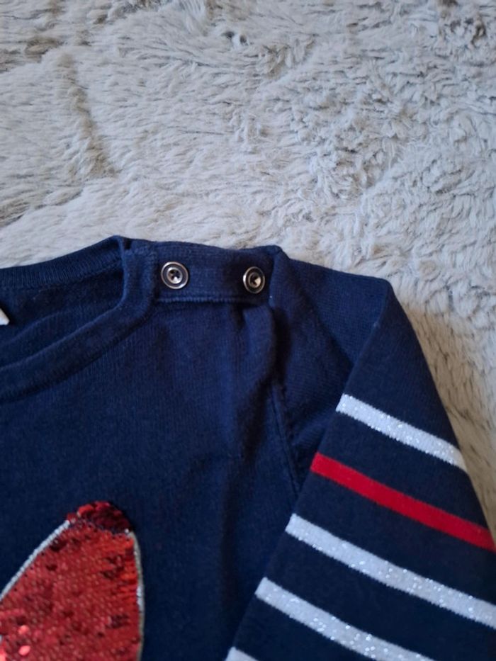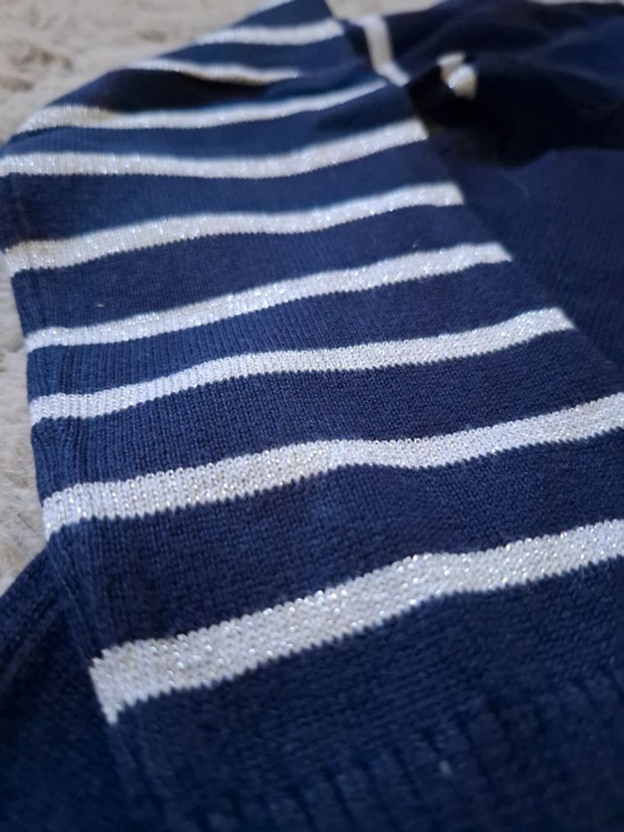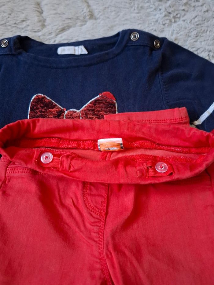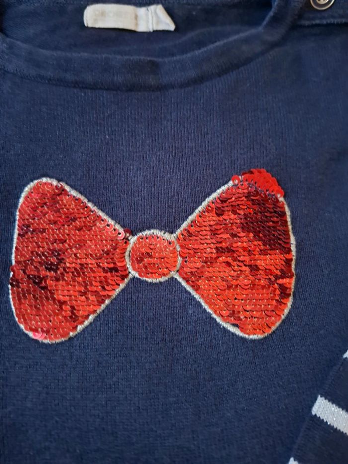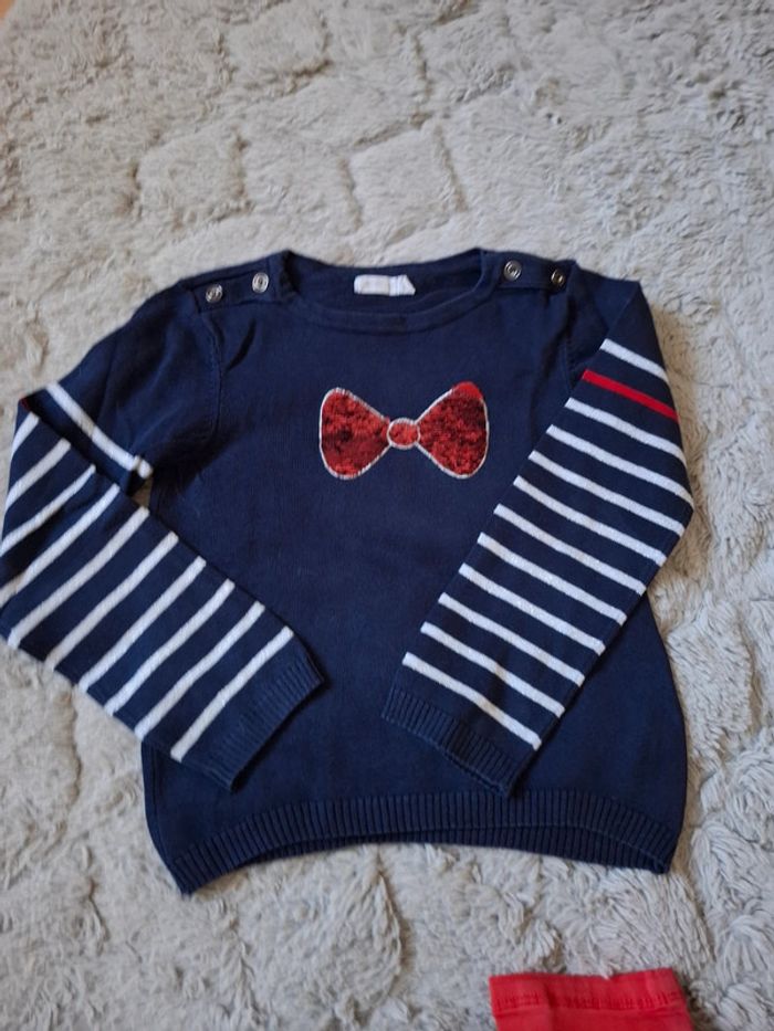 🌺 superbe ensemble jegging rouge 5 ans taille ajustable , poches marque TAO , pull en maille fine 6 ans orchestra bleu marine avec rayures argenté pailleté , un joli nœud 🎀 en sequins