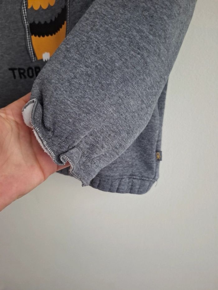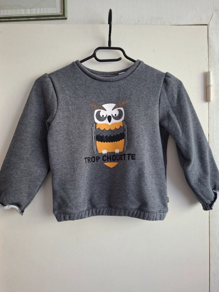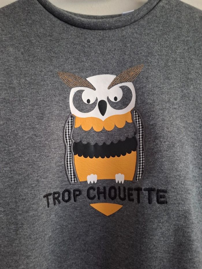 🌺 magnifique sweat gris avec une belle chouette et inscription trop chouette , intérieur en polaire blanc , bas des manches froncées et élastiquées