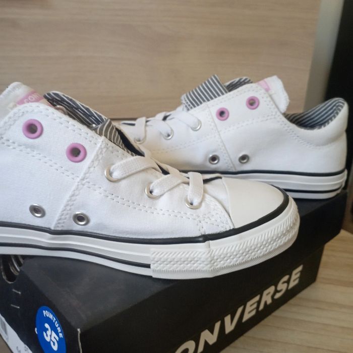 🌺 taille 35 🌺 Converse all star 🌺 Magnifique converse blanche, lacet élastique et languette a rayures blanches et noires, enfilage facile 🌺 Authentique acheté a Intersport 🌺 Boite fourni prix d'achat 44€99 🌺 Neuve #doudou19230_chaussuresfille