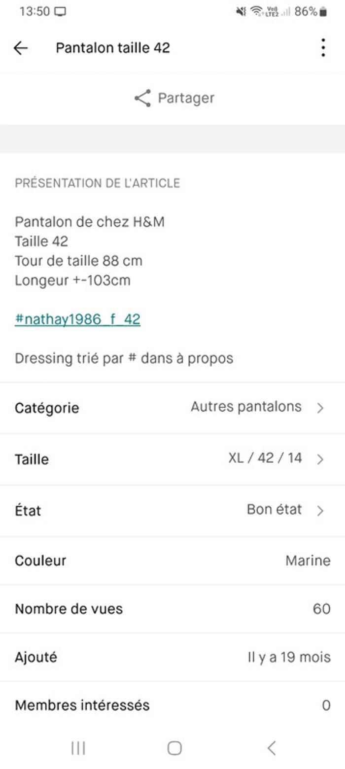Pantalon H&M taille 42 Longueur 103cm Tour de taille 88cm #nathay1986_f_42 Dressing trié par # dans à propos