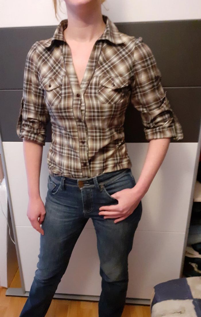 Blouse/ chemise yessica de C&A taille 36-38 sur l'étiquette il est indiqué 40 mais taille plus petit Possibilité de mettre manches 3/4 avec un bouton sur ma manche. Dressing trié par # dans à propos. #nathay1986_f_38