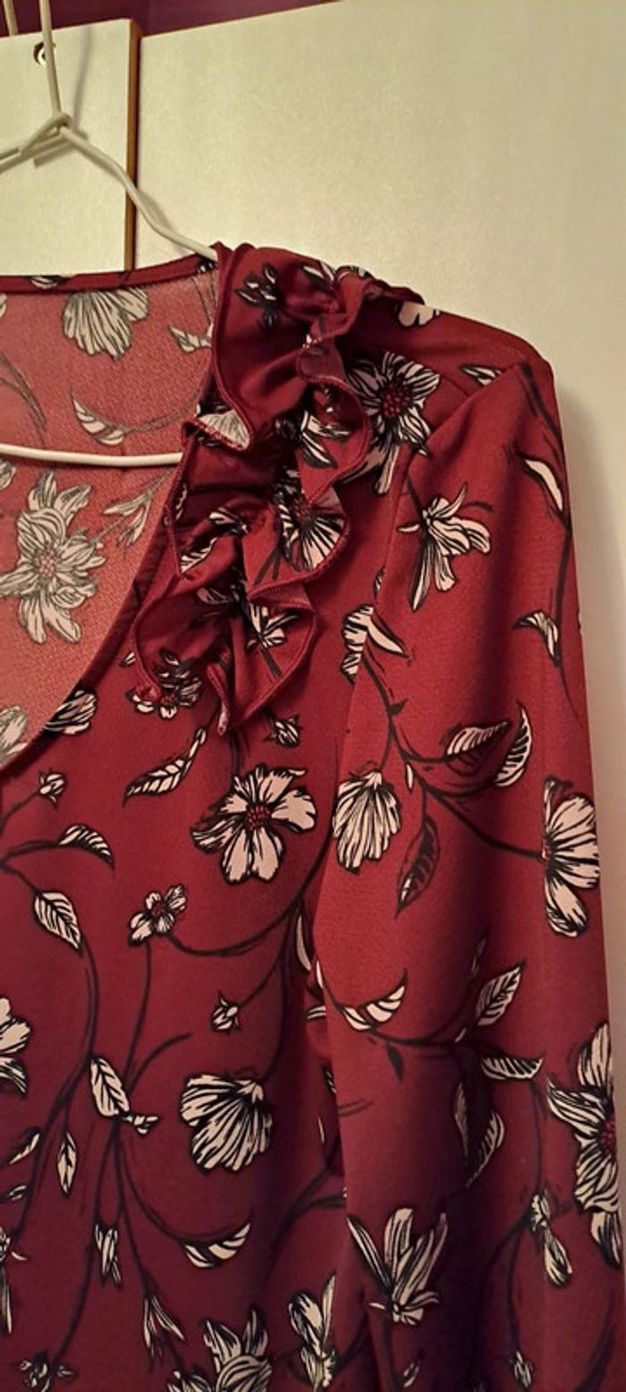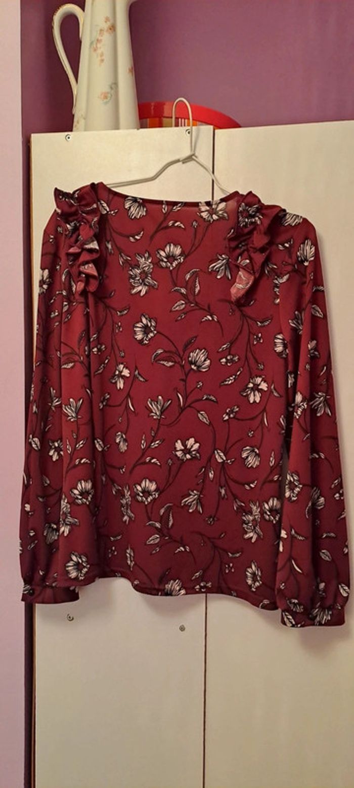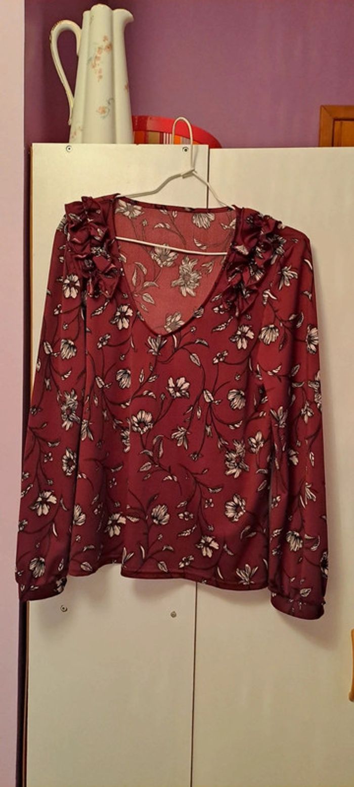 Jolie blouse, chic petits volants aux épaules, manches fermées par petits boutons. Sans repassage.