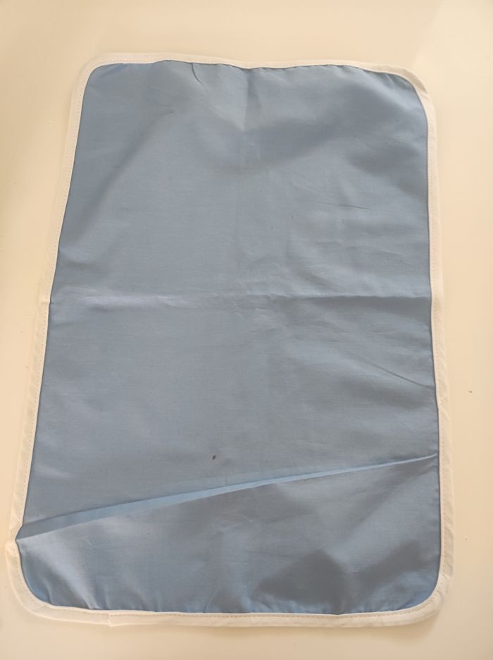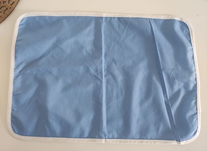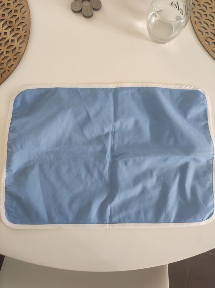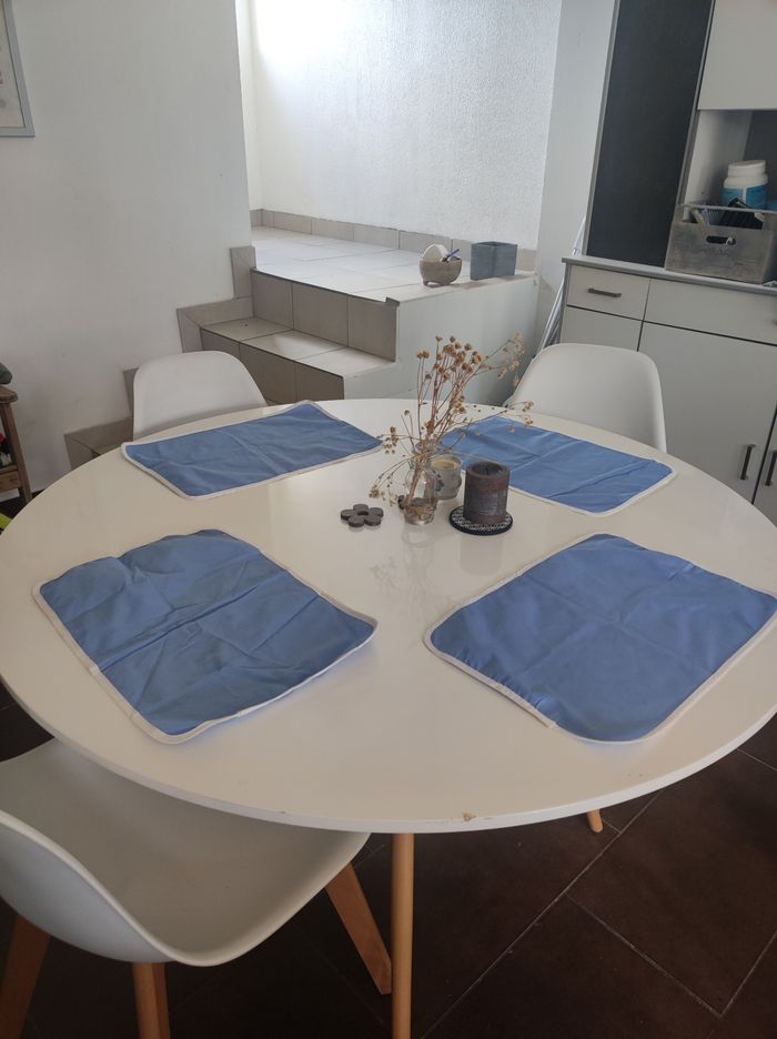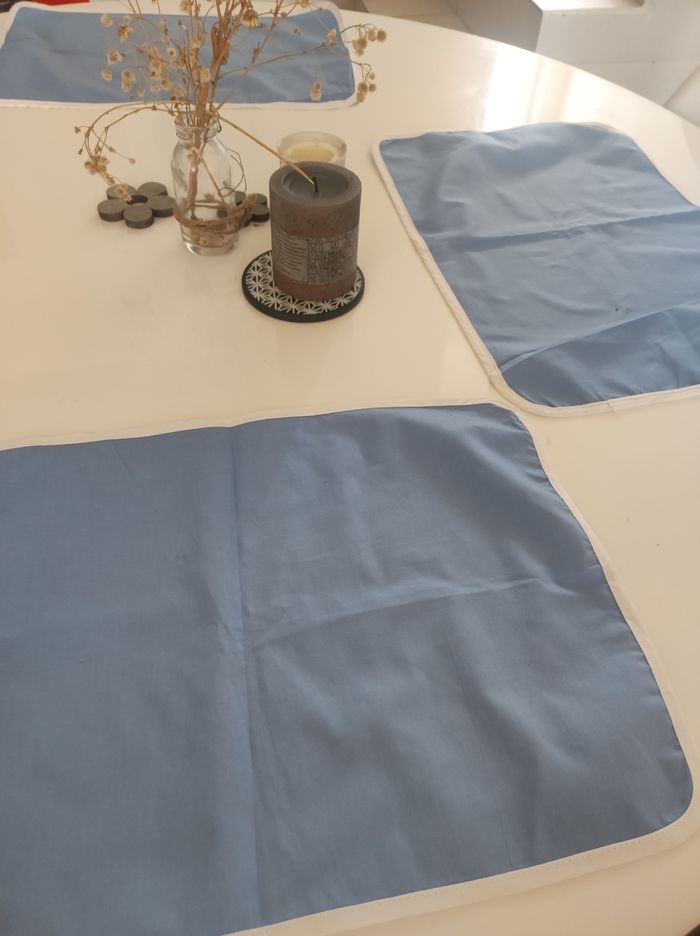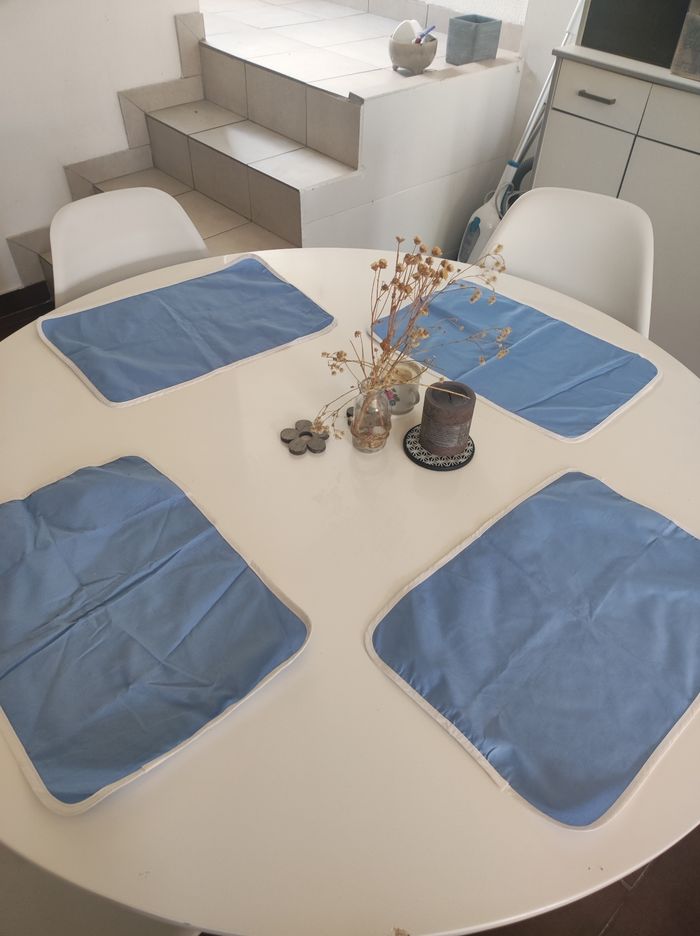 Lot de 4 sets de table en tissus Modèle ancien (années 70-80) Couleur bleu clair et contour blanc Facilement lavable / dimension 42 x 30 cm. Quelques imperfection quasi invisible (pris en photo -mini tâches sur un set), sinon en parfait état