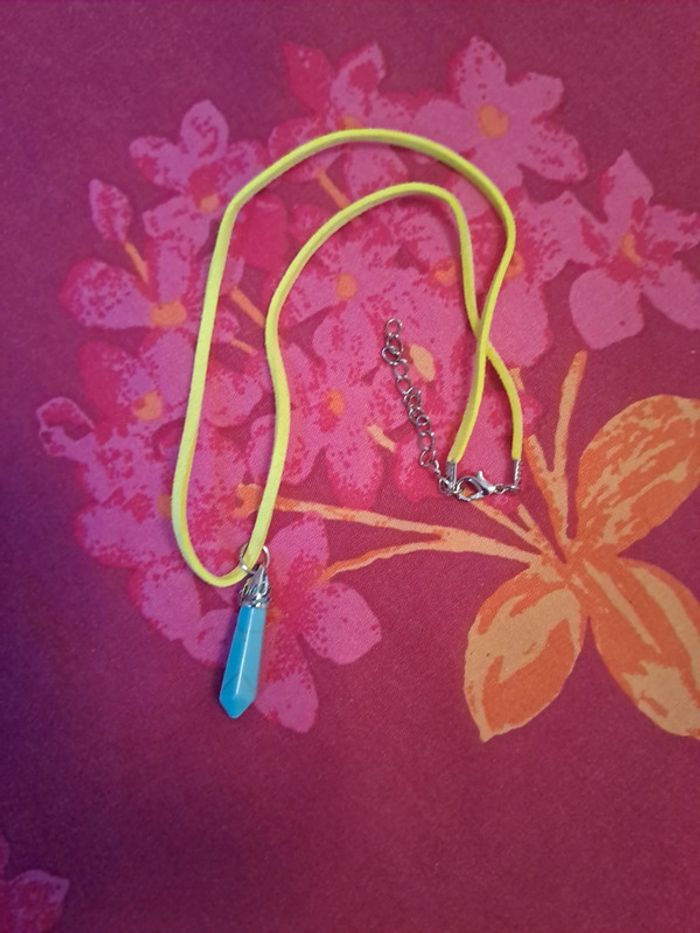 Très joli pendentif turquoise neuf avec cordon cuir jaune. Jamais porté.