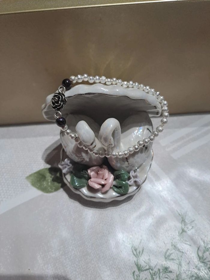 Très bon état, petite rose deux perles violette foncé, et perles argenté. Fil élastique.