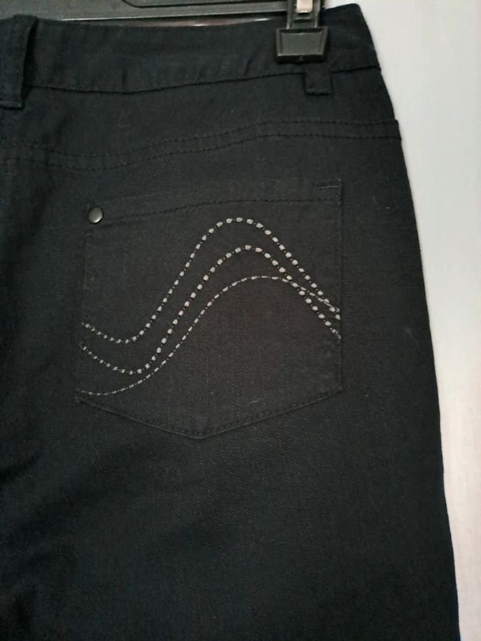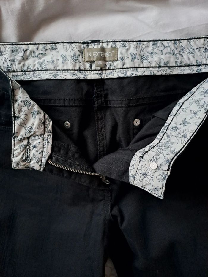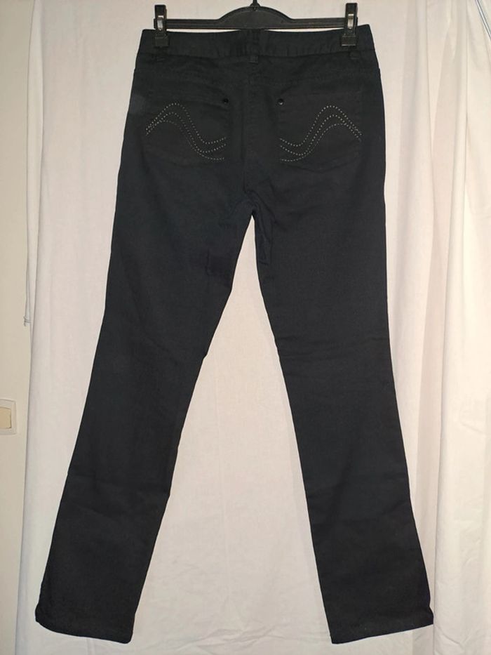 Un très joli pantalon, un beau tissu avec de jolis détails aux poches de même que pour la ceinture,très joli avec un chemisier blanc. 99%coton 1% élastane Longueur 105 cms Jamais porté, trop petit pour moi c était un cadeau.